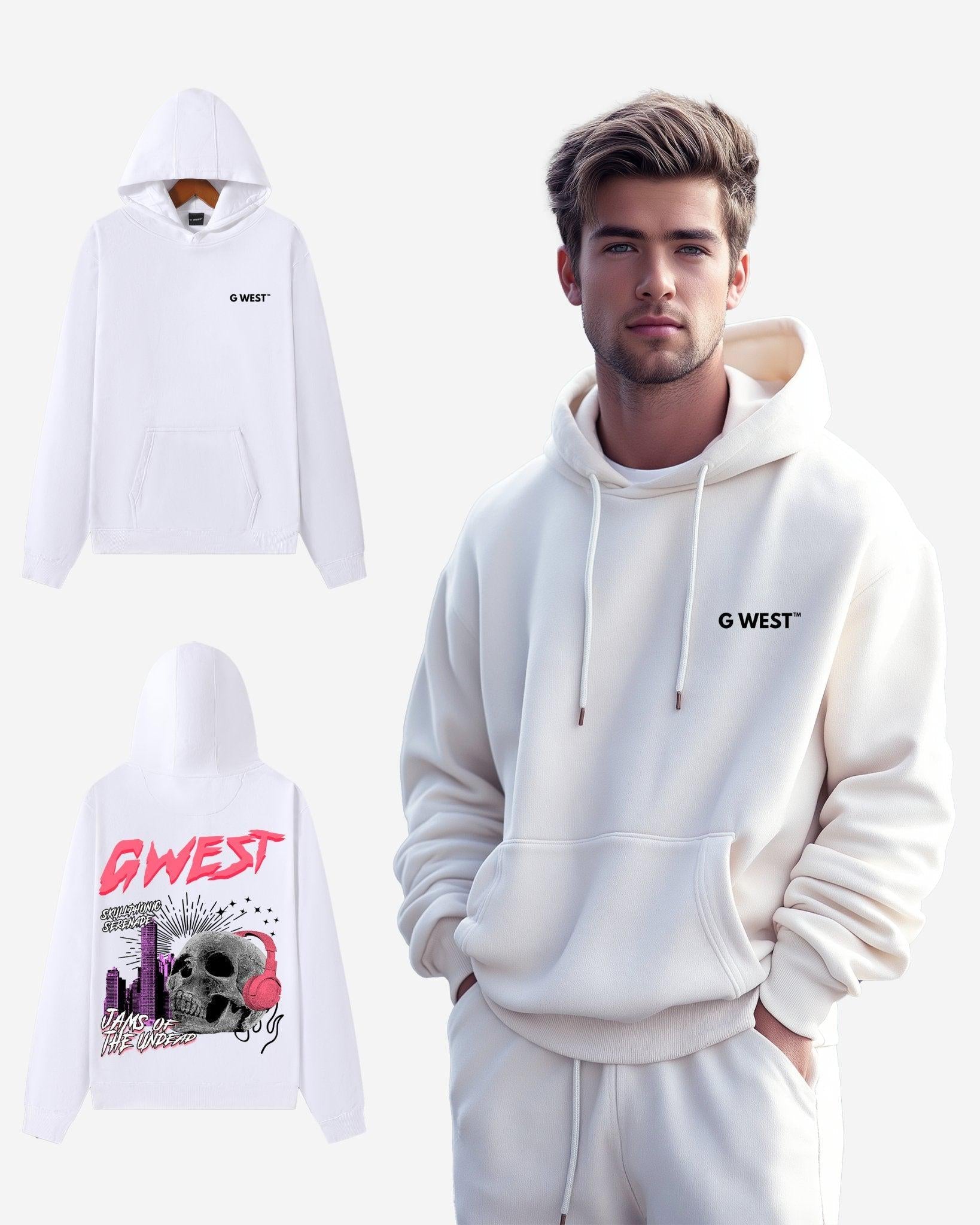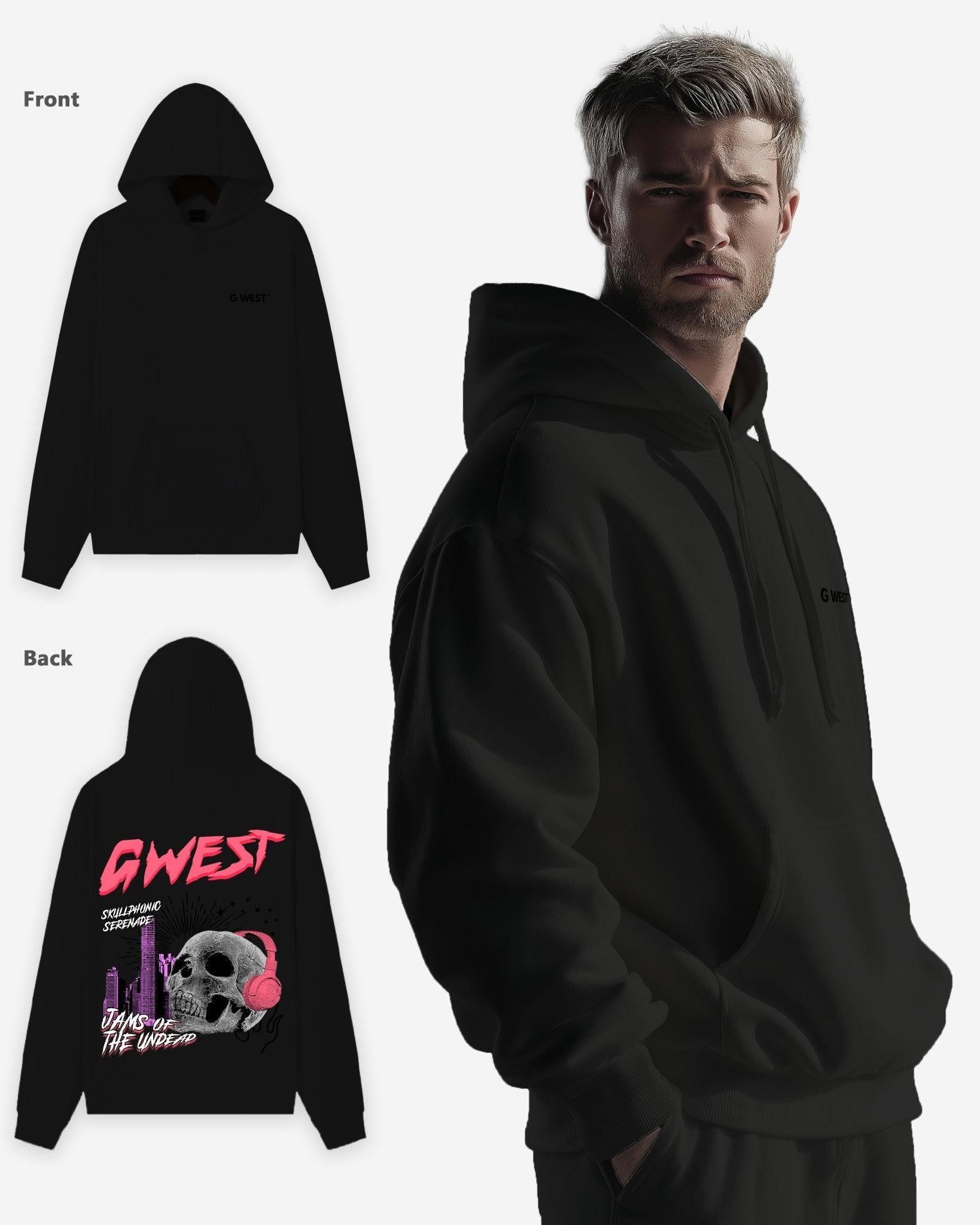 Experience a fusion of style and comfort with the G West Jams of the Undead Hoodie. This hoodie features a unique design inspired by the undead, complete with striking graphics that set it apart from the rest. Made from a premium cotton blend, it offers a soft, heavy-weight feel that keeps you warm and cozy. The classic hoodie silhouette includes ribbed cuffs and hem for a secure fit, an adjustable drawstring hood for customizable coverage, and a spacious kangaroo pocket for practicality. Perfect for making a bold statement, this hoodie effortlessly combines trendsetting style with everyday comfort.