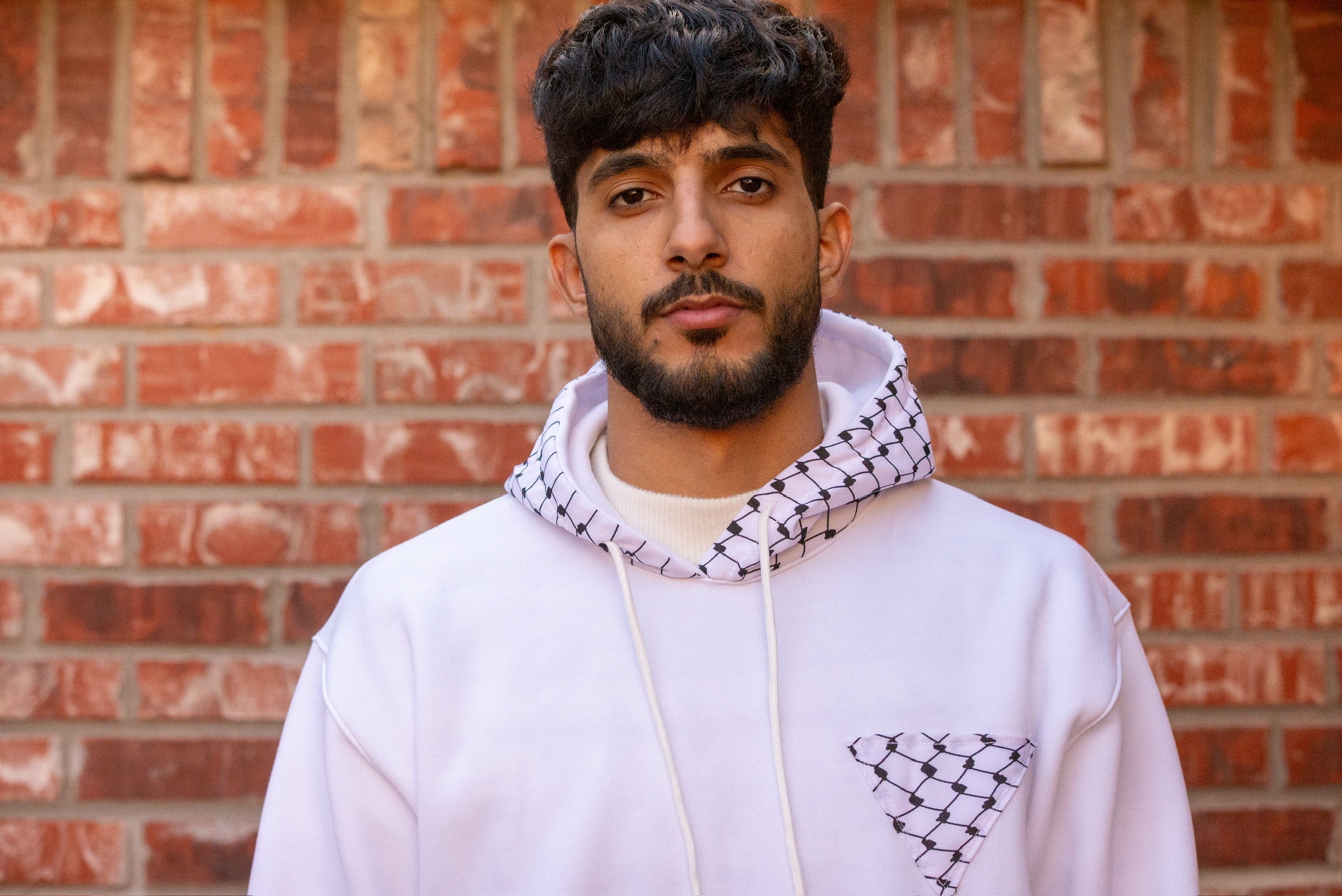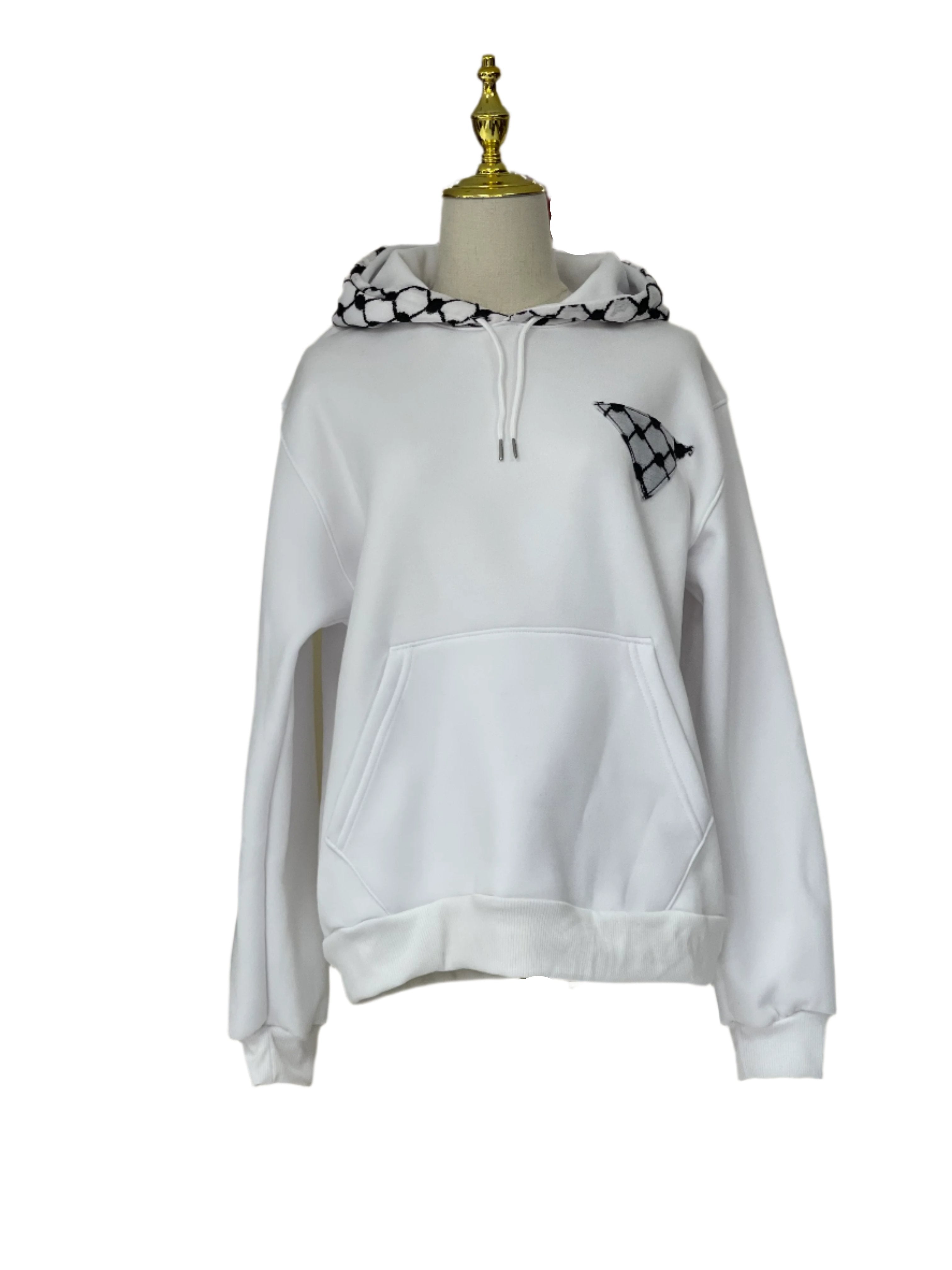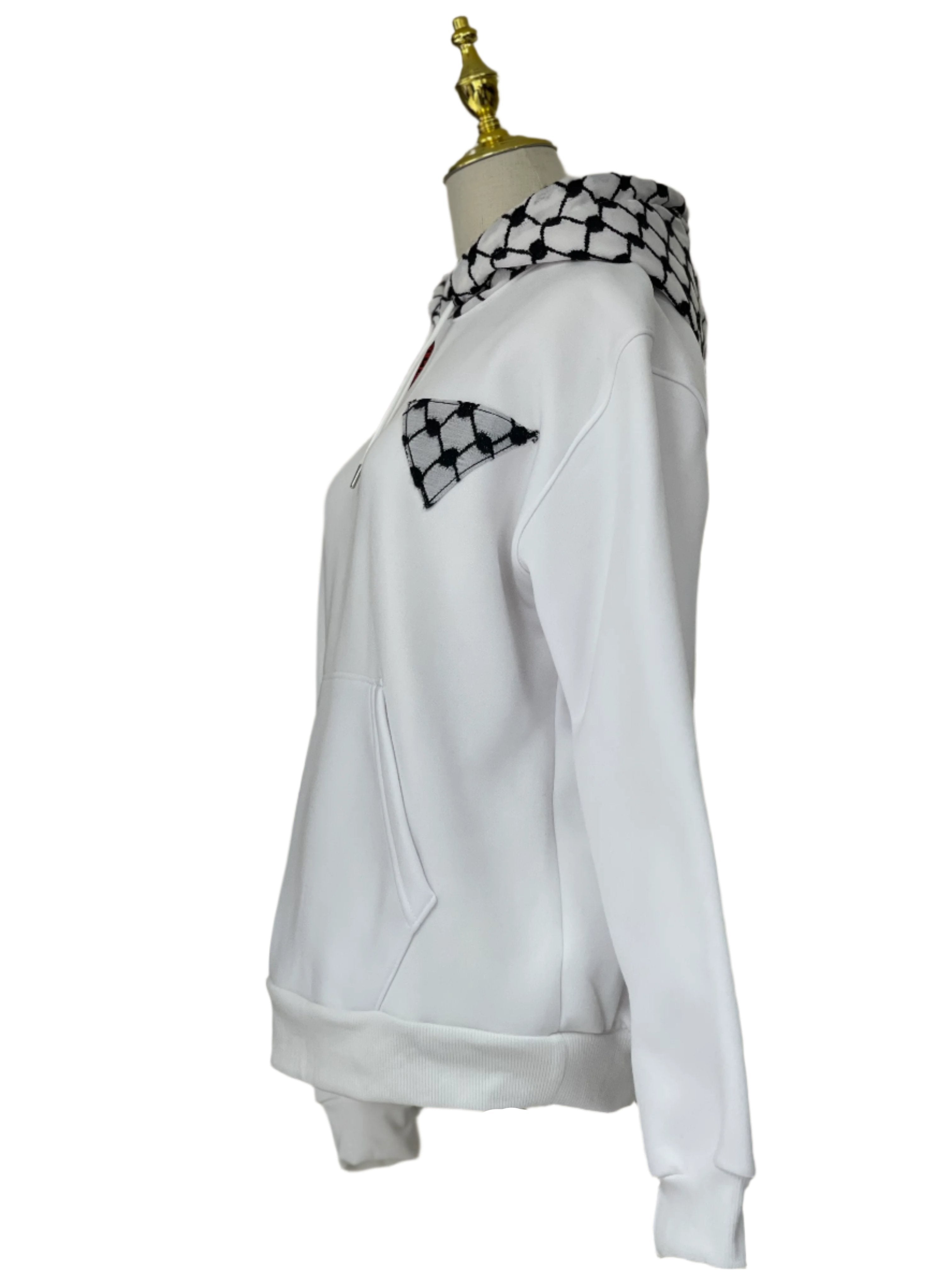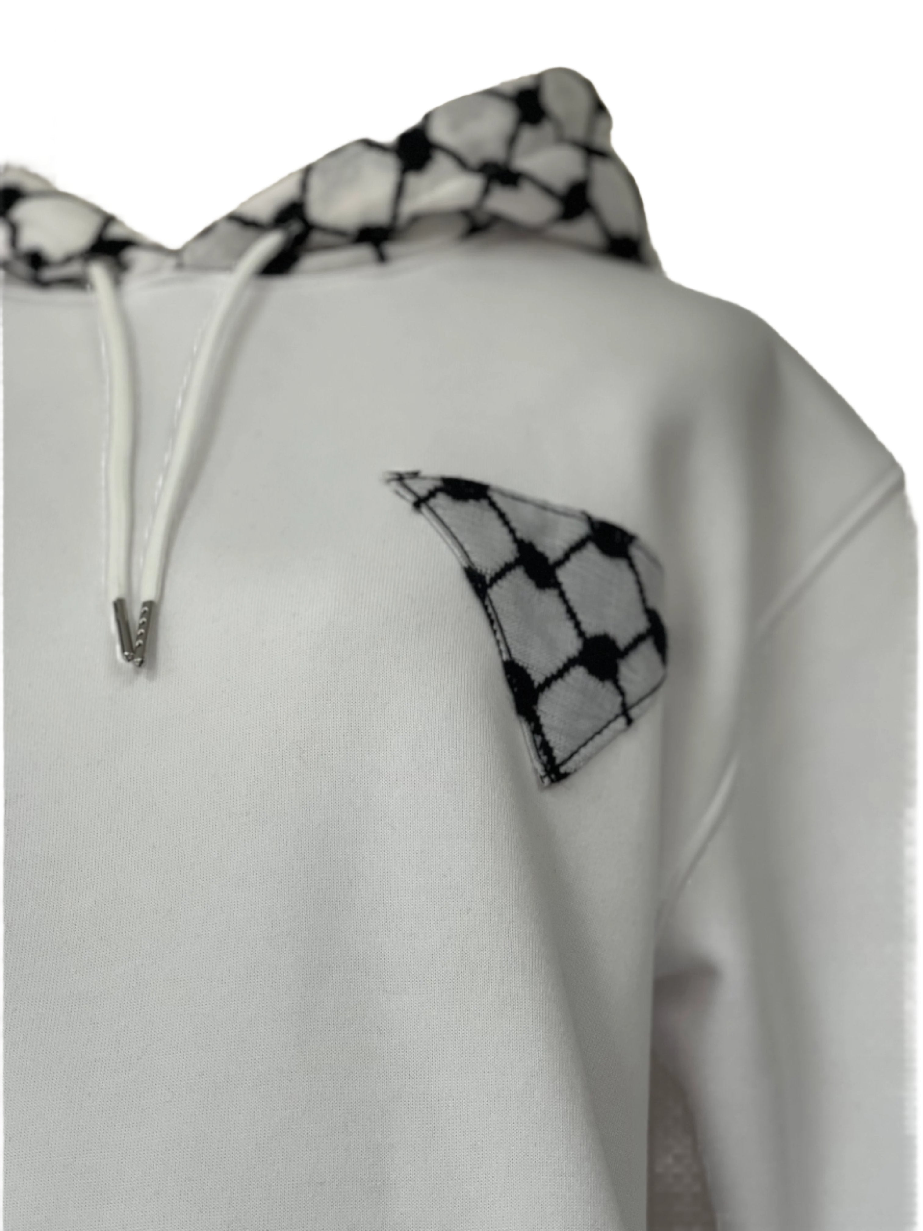 Make a bold cultural statement with our Pull-Over Hoodie, featuring an all-over Kufiyeh print and a unique triangle-shaped Kufiyeh design on the left chest. This hoodie seamlessly blends tradition with modern style, offering a distinctive look that stands out. Crafted for both comfort and style, it's perfect for fashionably showcasing your heritage. Whether you're heading out or enjoying a casual day, this hoodie is your go-to choice for expressing cultural pride with a contemporary twist.