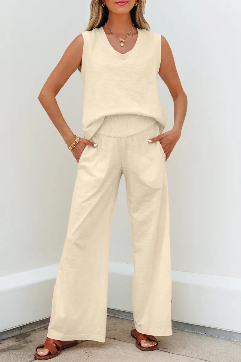 Elevate your casual wardrobe with the Beige Solid Color Tank Top and Smocked Waist Pants Set. This coordinated ensemble balances comfort and polish for everyday outings.