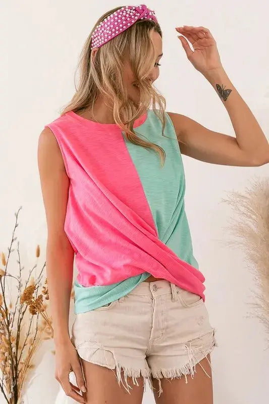 Trendsi Slub Terry Color Block Top Women's Casual Tank Twisted, USA Ship ‐ N.PINK/N.MINT / S