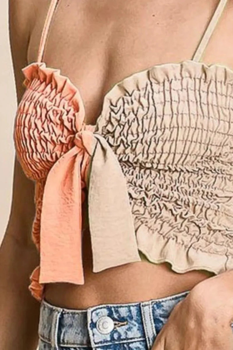 BiBi Woven Color Block Smocked with Ribbon Bra Top for Women ‐ PEACH/OATMEAL / S