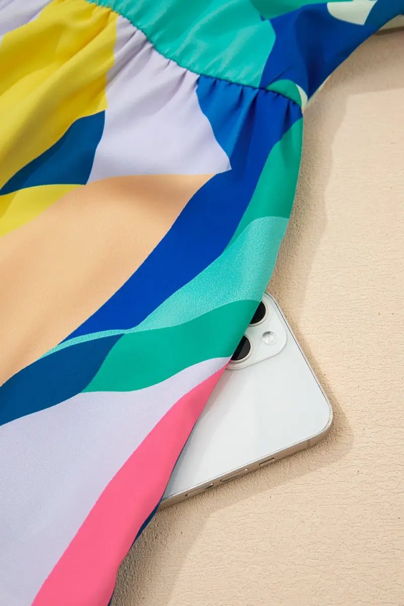 Blue Abstract Print V Neck Cap Sleeve Pocketed Mini Dress