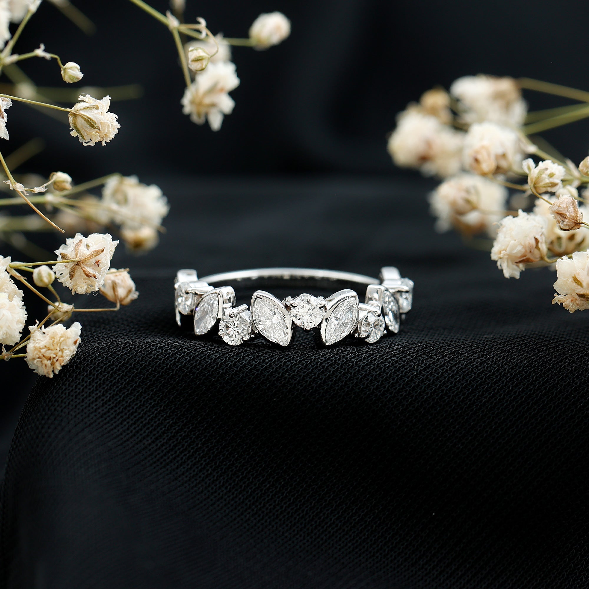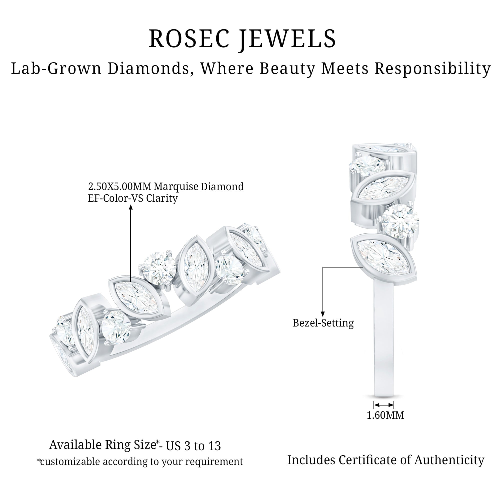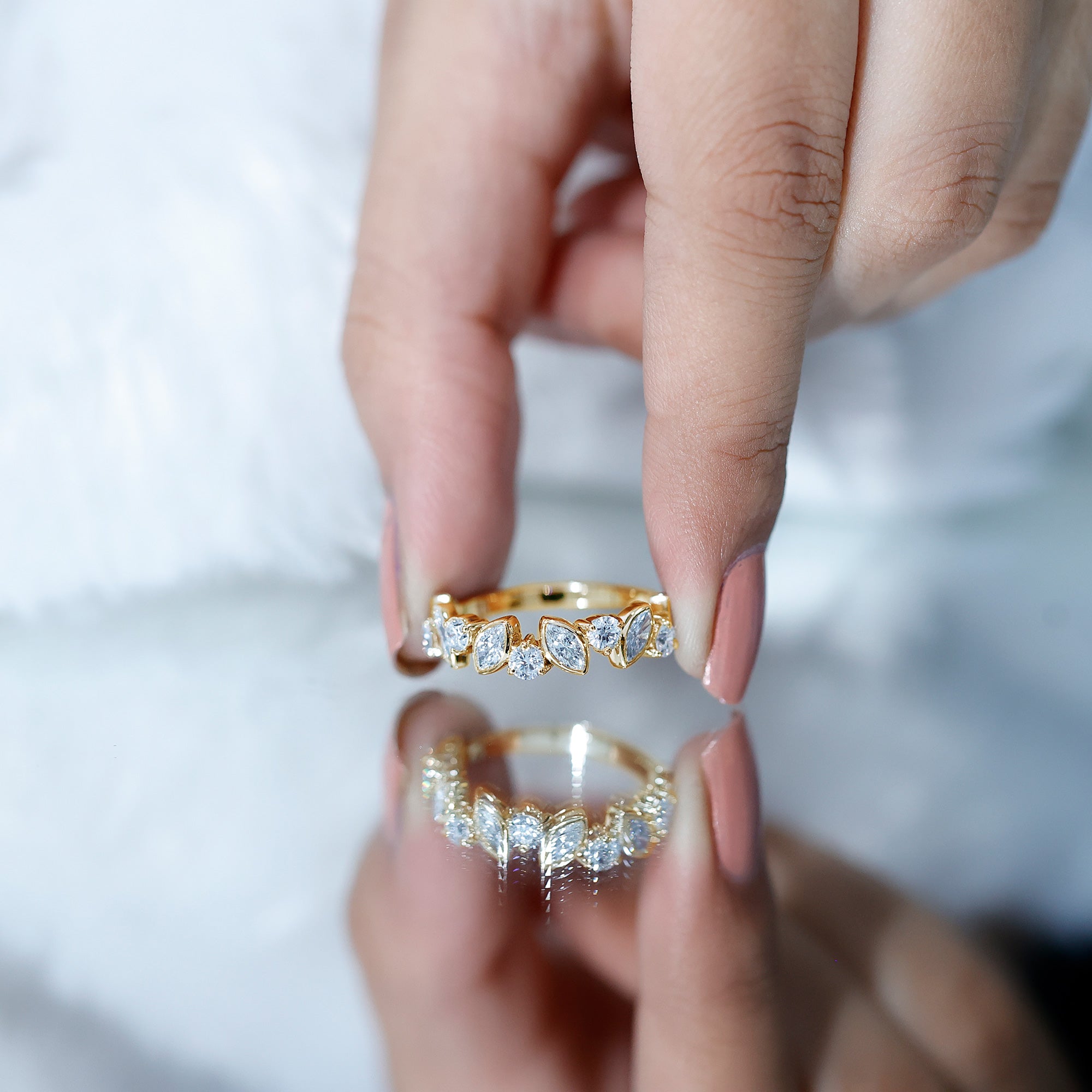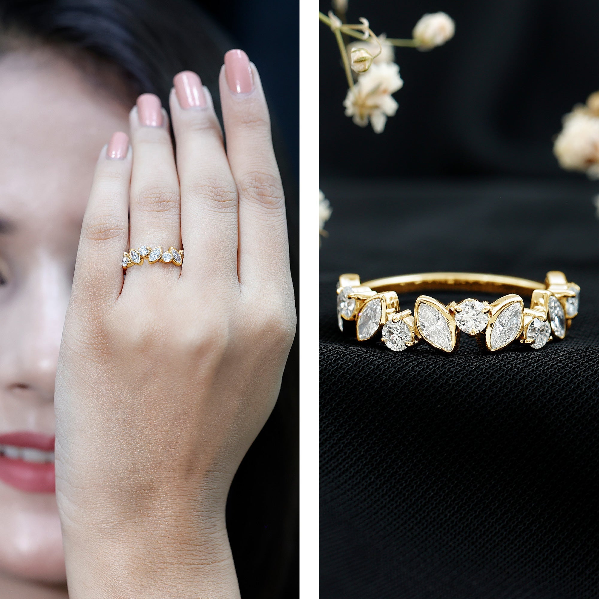 Our Diamond Anniversary Ring has a unique yet timeless aesthetic that will never go out of style. This Half Eternity Ring features marquise shaped diamonds in bezel setting and round shaped diamonds in prong setting, all set alternatively to create a unique piece of jewelry. This versatile piece pairs beautifully with another ring for a stacked look or can be worn solo as a statement of understated glamour. Plus, since the stones of this Diamond Eternity Ring are lab-grown, you get the luxury of fine jewelry without breaking the bank. This Minimalist Ring comes with a certificate of authenticity and a premium packaging box. If you are buying this as a gift for her, it is ready to be given the moment it arrives.