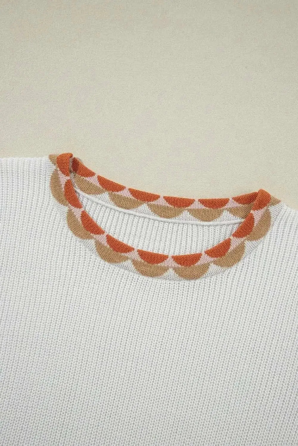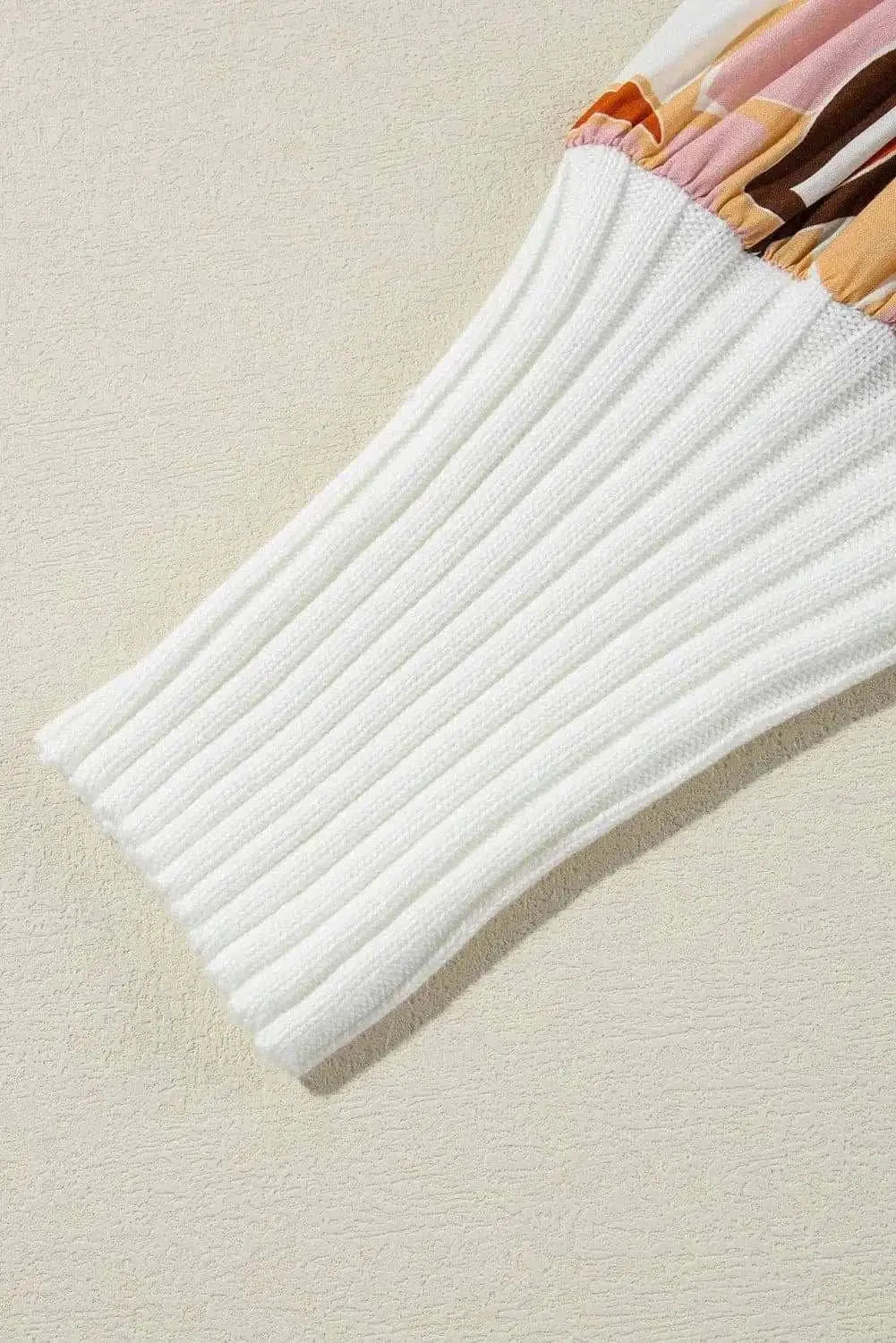 Designed for refined everyday wear, this knit top combines comfort with a contemporary silhouette. The round neckline sits neatly against the collarbone, while lantern sleeves create a flattering, voluminous shape. The white knit body is accented by a warm, multicolored sleeve pattern for subtle visual interest. The piece layers easily over or under other wardrobe staples and pairs well with denim, skirts, or tailored pants.