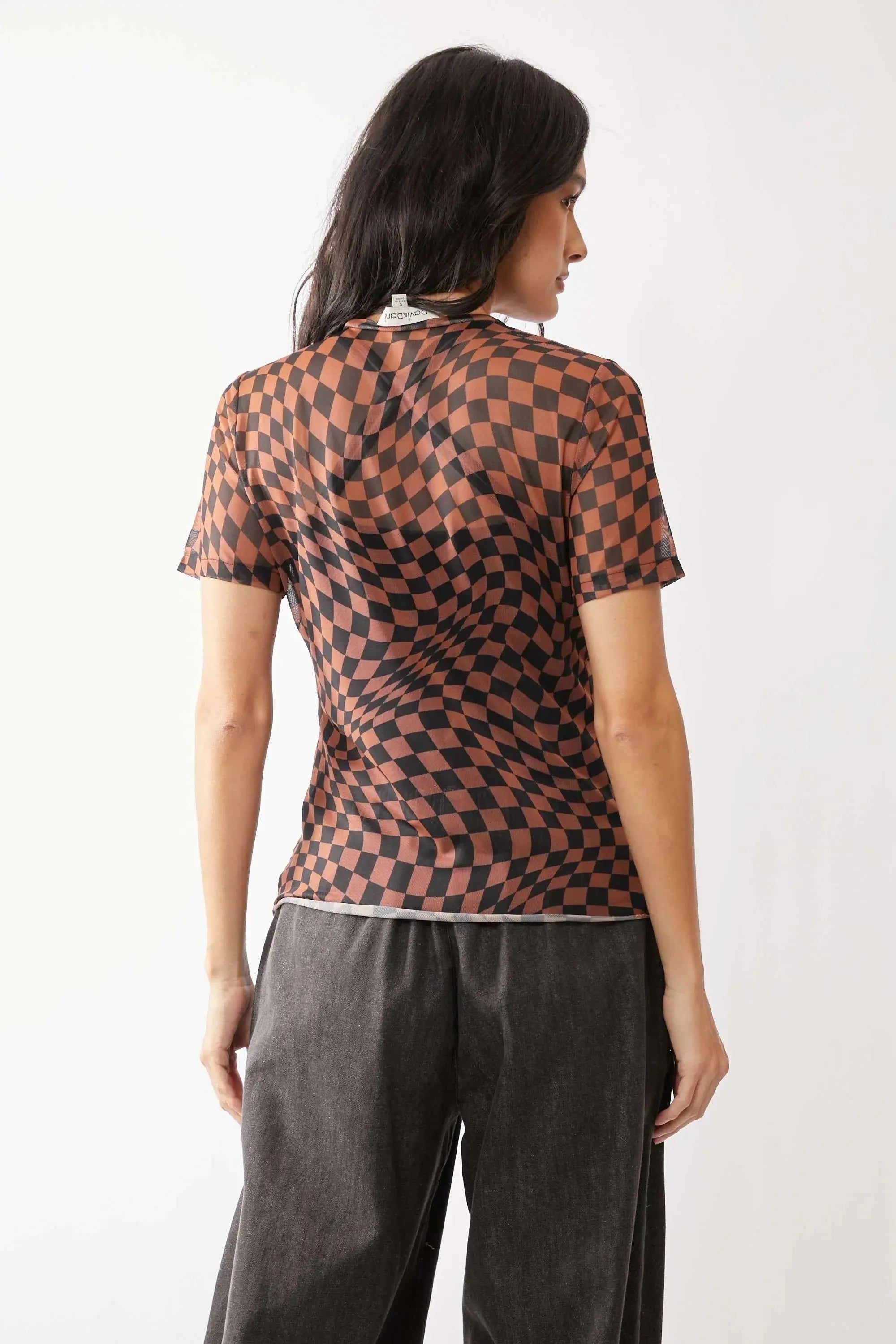Trendsi Checkerboard Mesh Top Women's Casual Tee Lightweight, Breathable ‐ BROWN BLACK / S