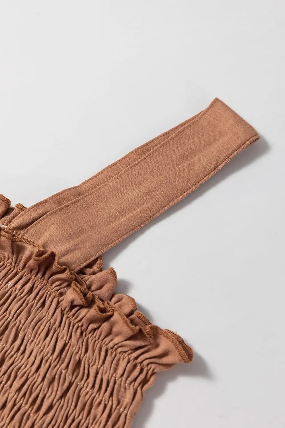- Sleeveless design with a shirred bodice and ruffled neckline