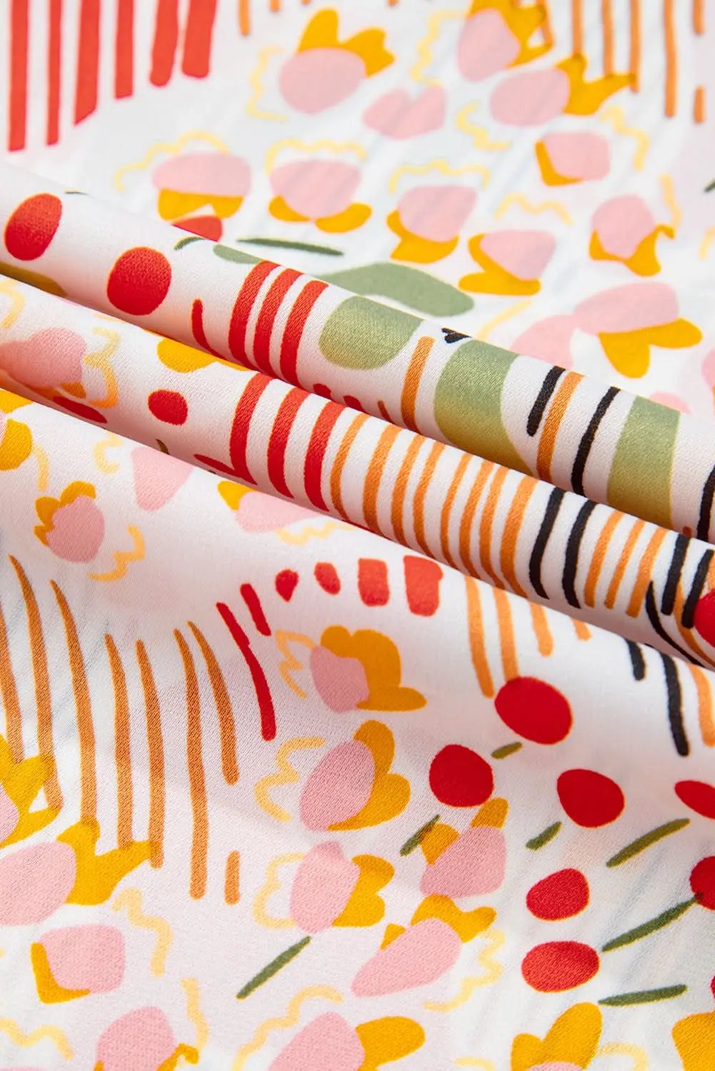 The lightweight, breathable design uses 100% polyester and features a multicolored floral abstract print on a light background for versatile wear.
