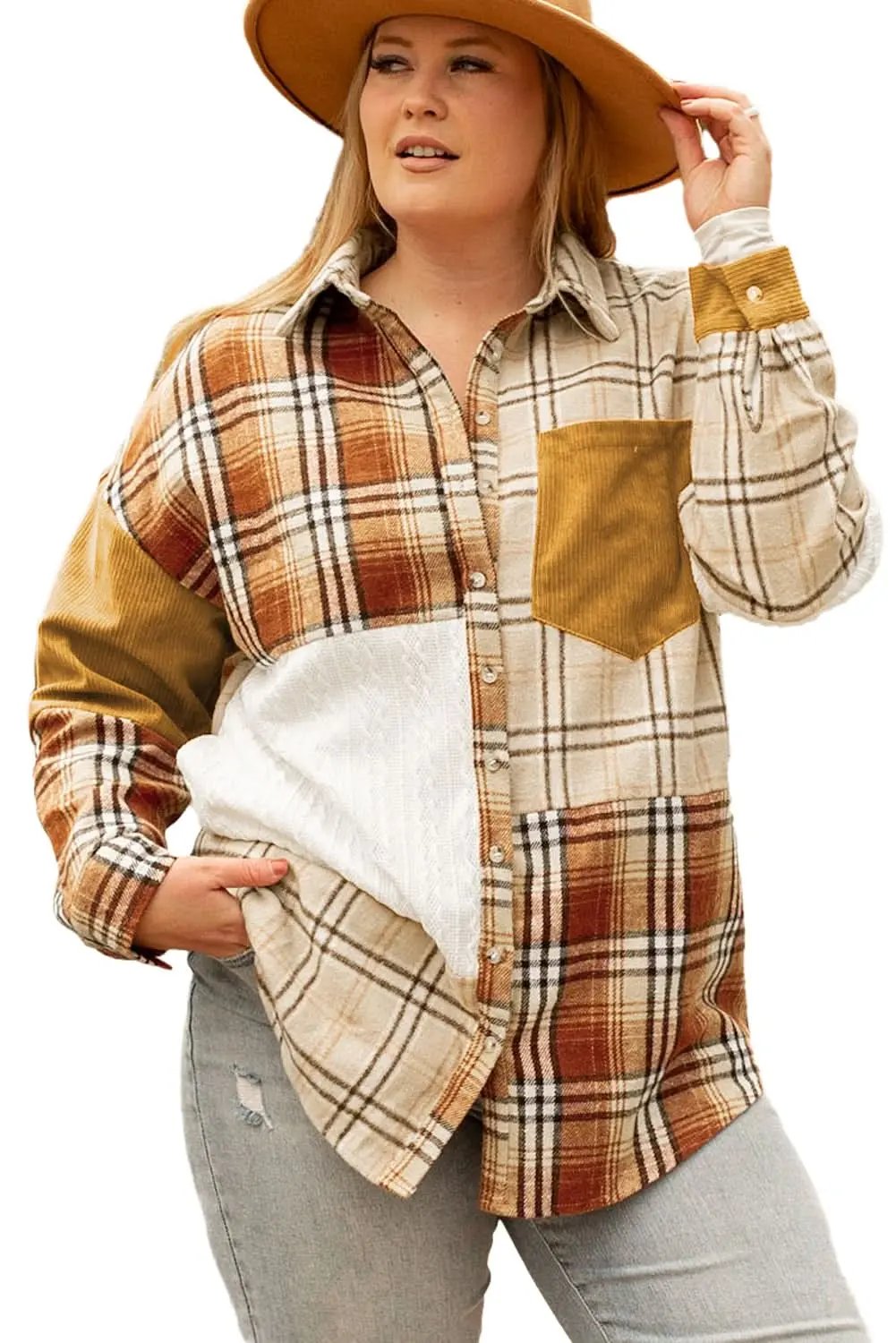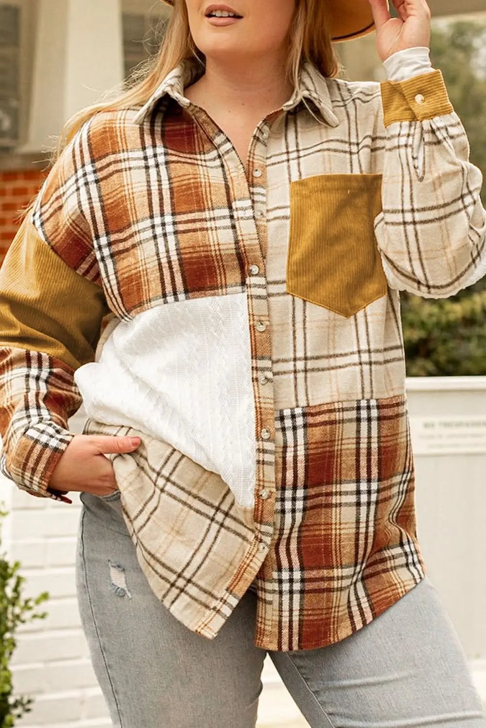 Golden Apricot Plaid Patchwork Shacket — Plus Size