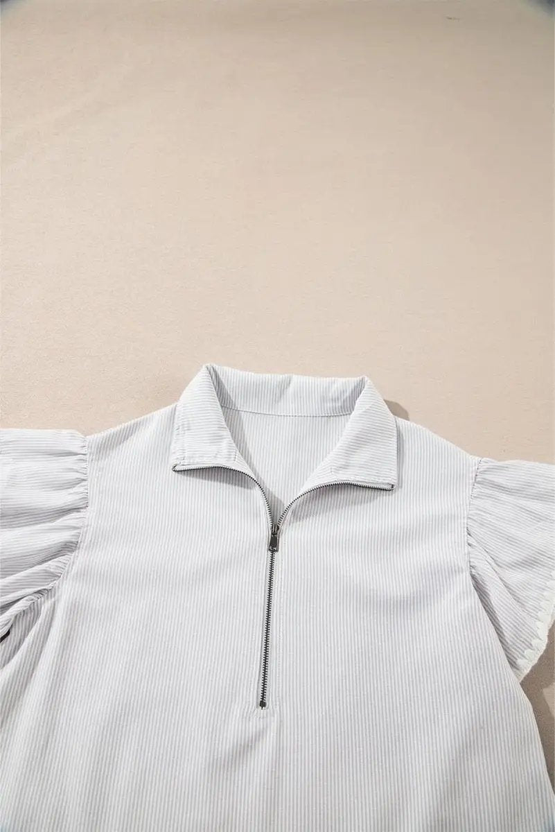 Gray Striped Short Sleeve Zipped Collar Top & Wide Leg Pants Set