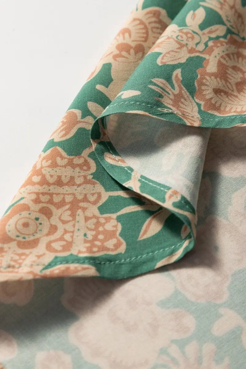 The green base is adorned with an understated beige floral print, giving a versatile, seasonal look. A buttoned front adds a classic touch and makes it simple to pair with jeans or skirts for a range of occasions from casual days out to office wear.