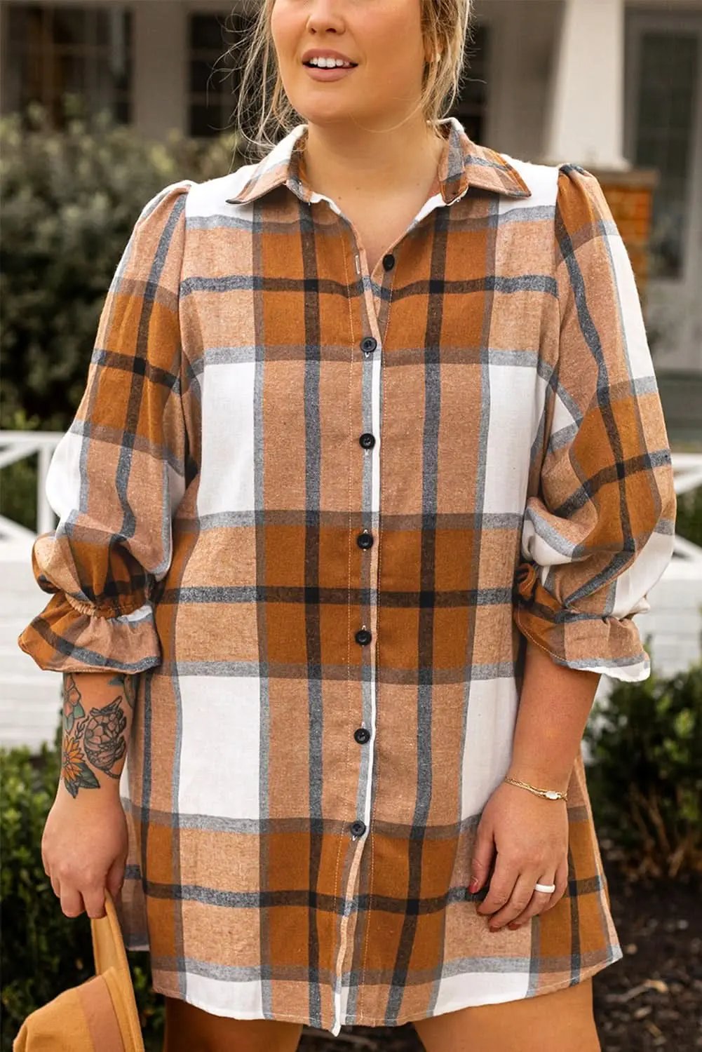 Elevate your wardrobe with our Khaki Plaid Plus Size Dress featuring flounce sleeves. This mini dress blends a timeless khaki plaid with a front button-up design for a refined, versatile silhouette. The flounce sleeves provide gentle volume, while the cut is designed to flatter curves in plus sizes. Crafted from a 65% polyester and 35% cotton blend, the dress offers comfort, durability, and easy care for daily wear or special outings.