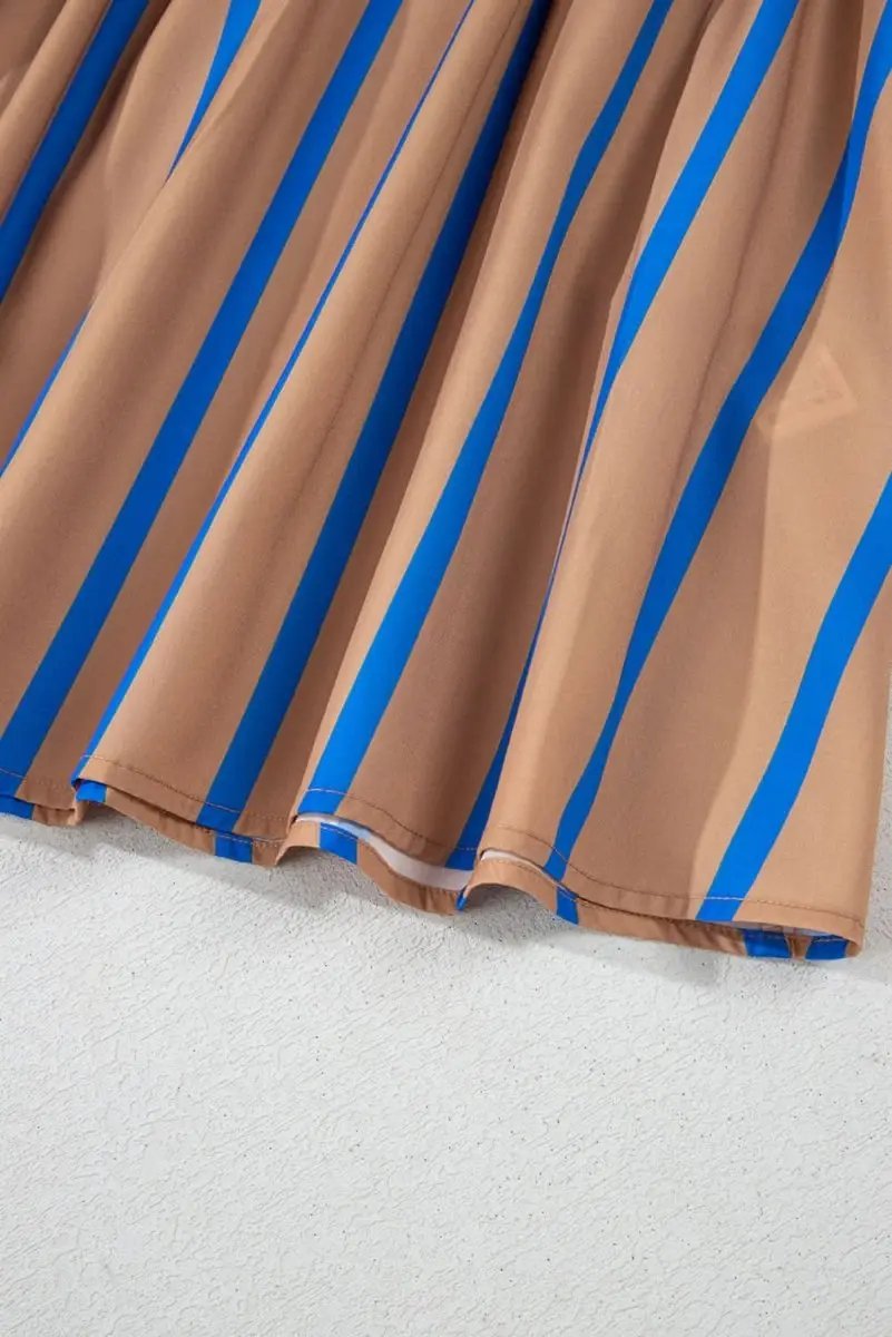 Refresh your everyday look with a dress designed for comfort and ease. The khaki base features a bold blue stripe contrast that runs across the bodice and sleeves, delivering a modern, versatile aesthetic. The babydoll silhouette provides a forgiving fit that flatters a range of shapes, while the 3/4 sleeves with elastic cuffs offer a secure, comfortable feel from morning to evening. A self-tie front adds adjustable neckline coverage and a touch of refinement.
