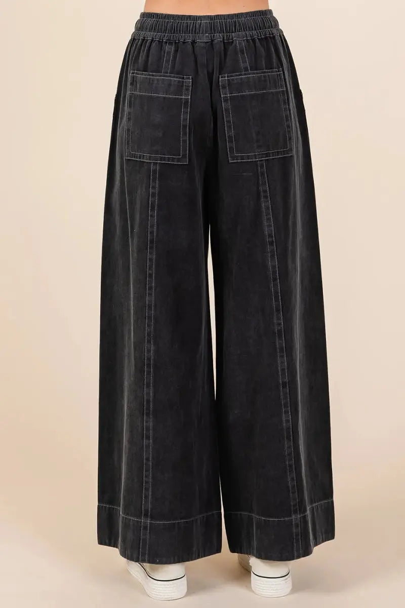Trendsi Mineral Wash Pants Women's Casual Wide Leg Twill Pants Elastic Waist Comfort ‐ BLACK / S