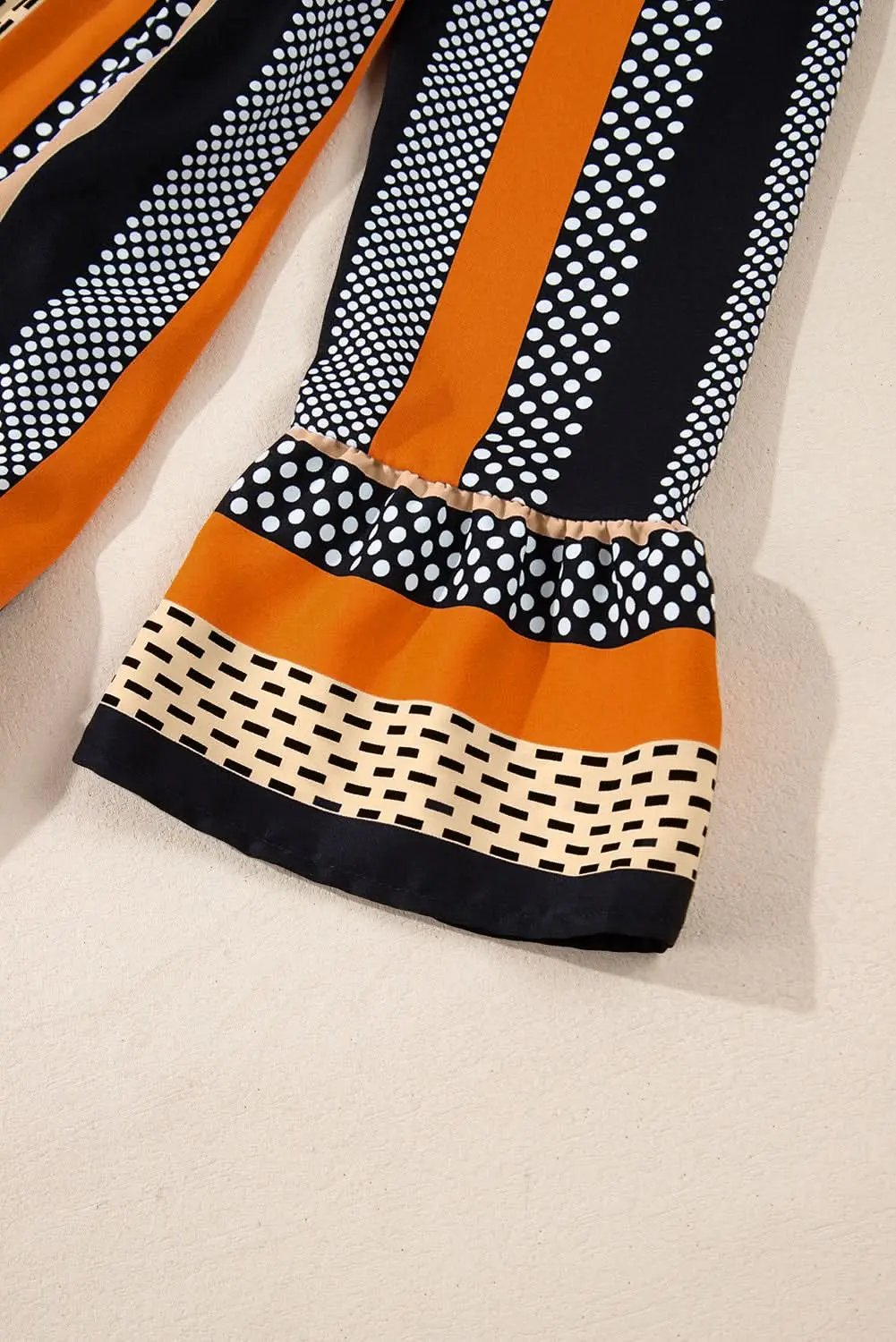 The pattern combines black and white polka dots with warm rust and beige panels for a distinctive, modern look. The ruffled hem adds movement and a touch of playfulness to the design.