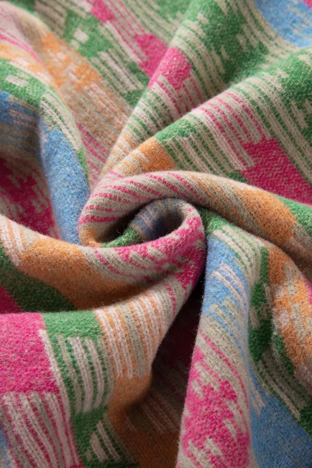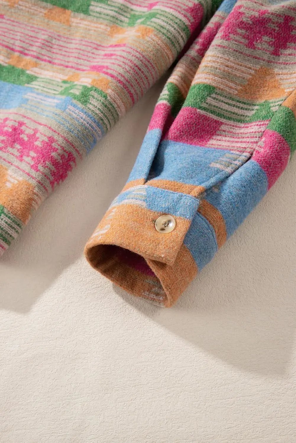 The bold multicolored aztec pattern blends pink with teal, green, and beige accents. Functional flap pockets provide storage for essentials, while a button-front and fold-down collar offer a polished, versatile look. The relaxed fit layers easily over tops and under jackets, and pairs well with jeans or skirts for daily wear. It delivers lightweight warmth for transitional seasons without bulk.