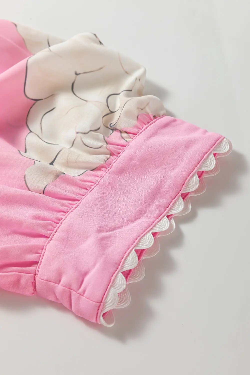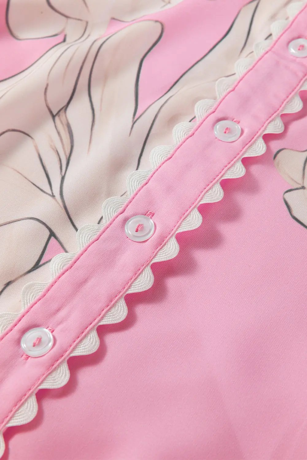 Rose Floral Ric Rac Edge Puff Sleeve Button Up Shirt