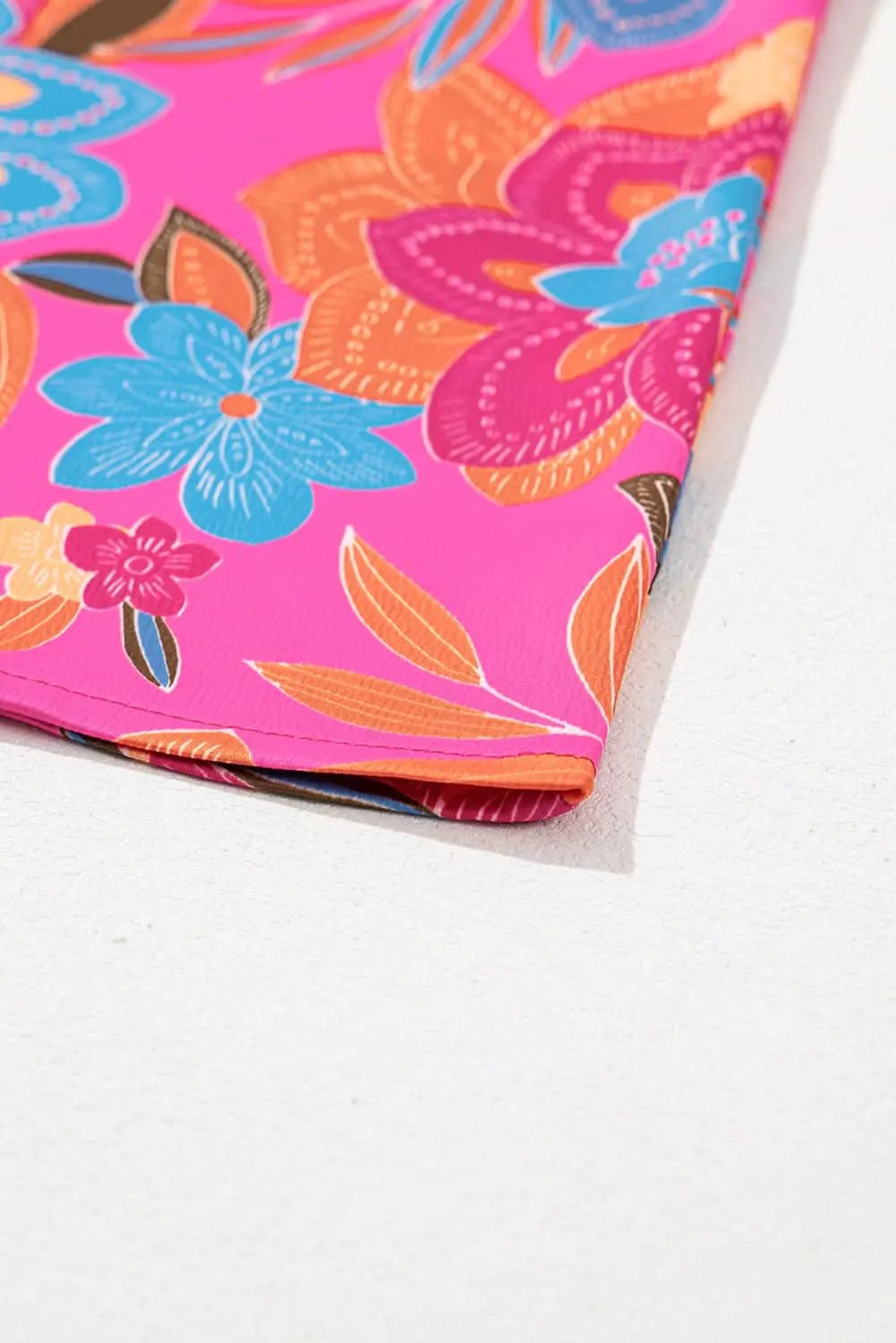 The design features a vibrant pink floral print with blue and orange accents, a feminine ruffled round neckline with delicate pleated details, and puff sleeves finished with smocked ruffle cuffs. A back button closure with a keyhole ensures easy wear while maintaining a clean front.