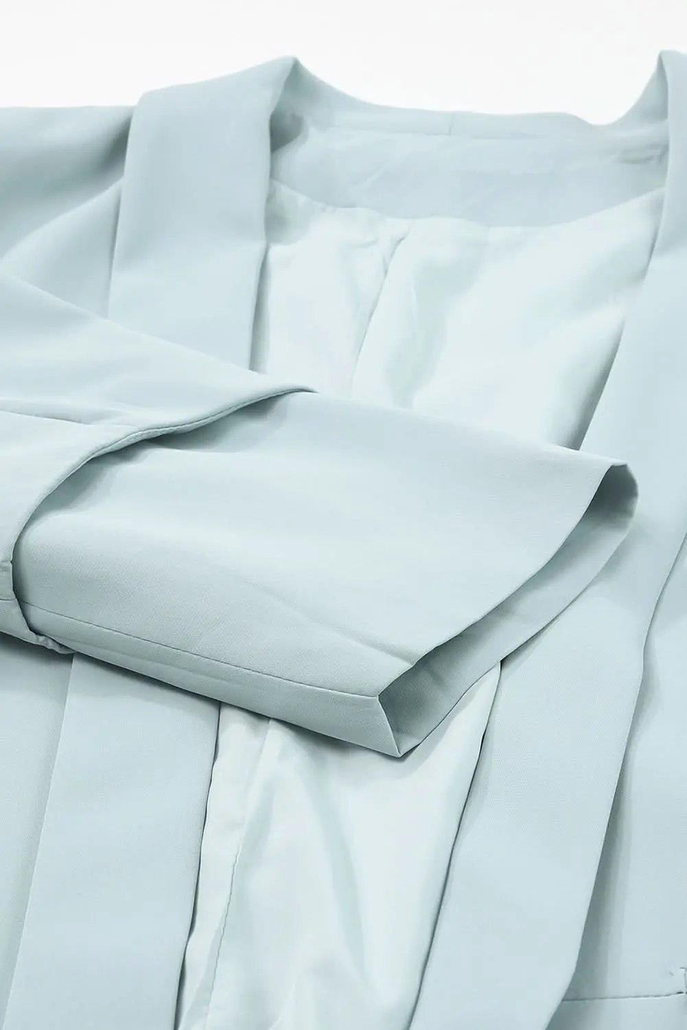 Elevate your professional wardrobe with our sky blue plus-size lapel blazer. Crafted from 100% polyester, this blazer offers a soft, lightweight feel that drapes comfortably. The collared lapel and open front provide a modern, refined silhouette suitable for office wear and after-hours events.