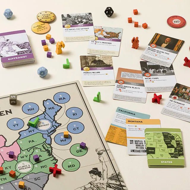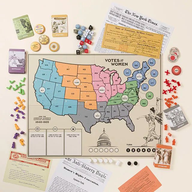 Votes for Women captures and celebrates the struggle by inviting players to join the suffrage movement, organize support, and campaign for victory across the 48 states that were called to ratify the 19th Amendment in 1919-1920. The card-driven game can be played cooperatively, competitively, or in solitaire mode, and in each version players must navigate the historic events, movement schisms, and political challenges of the era to win. The board is simple to set up and the artwork is inspired by the classic designs used by suffragists themselves.