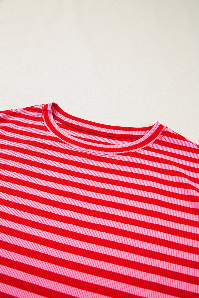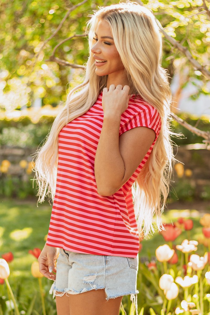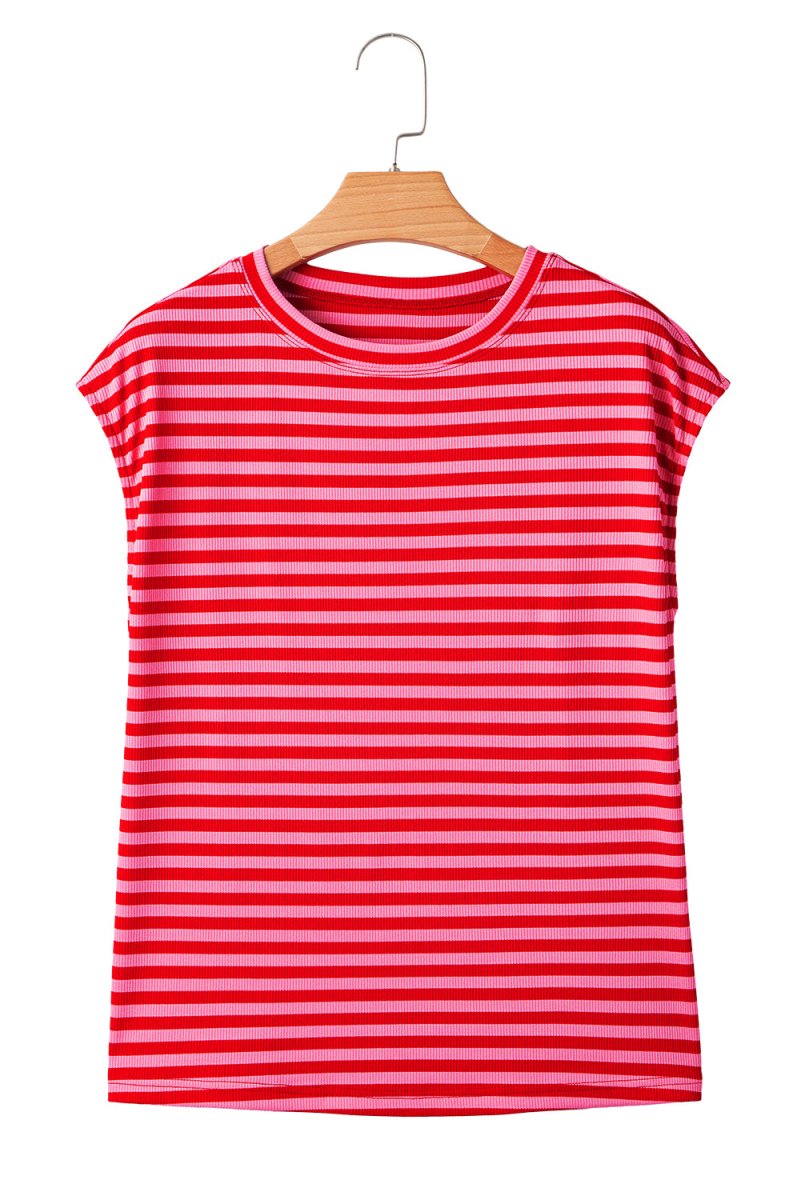 Red Stripe Ribbed Cap Sleeve Round Neck T Shirt for Women