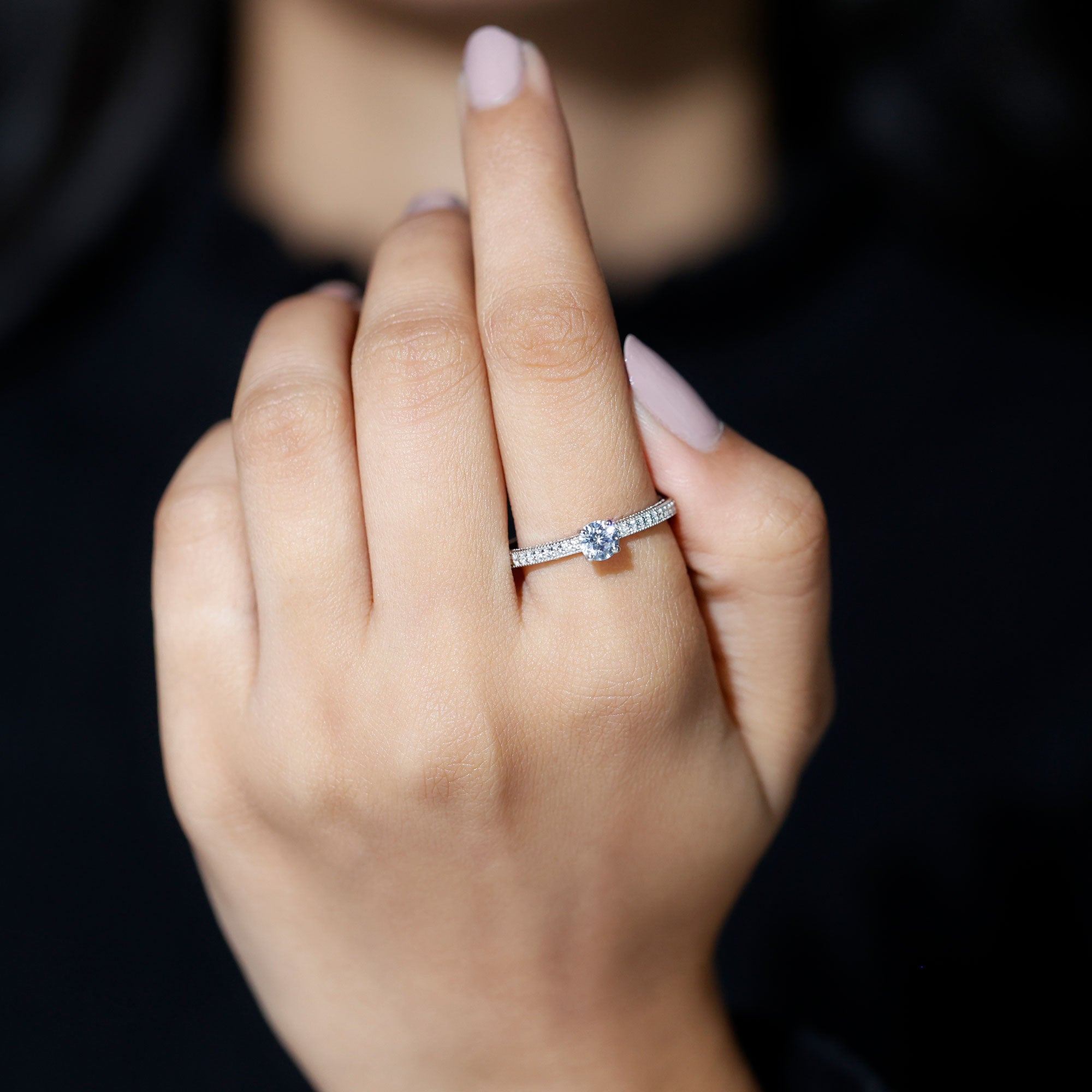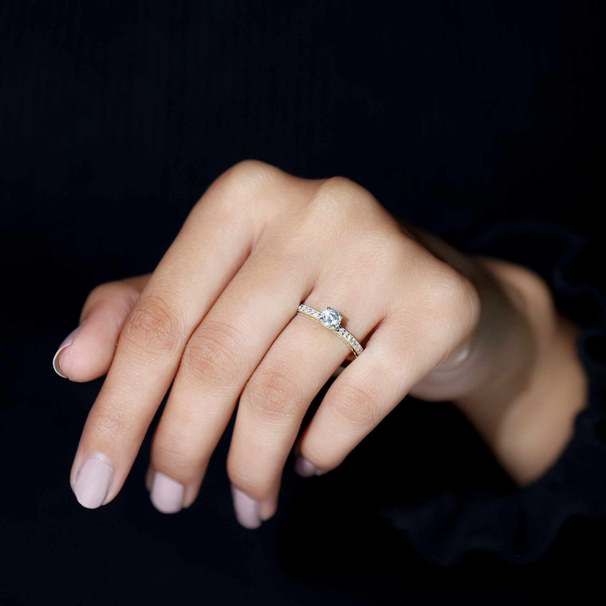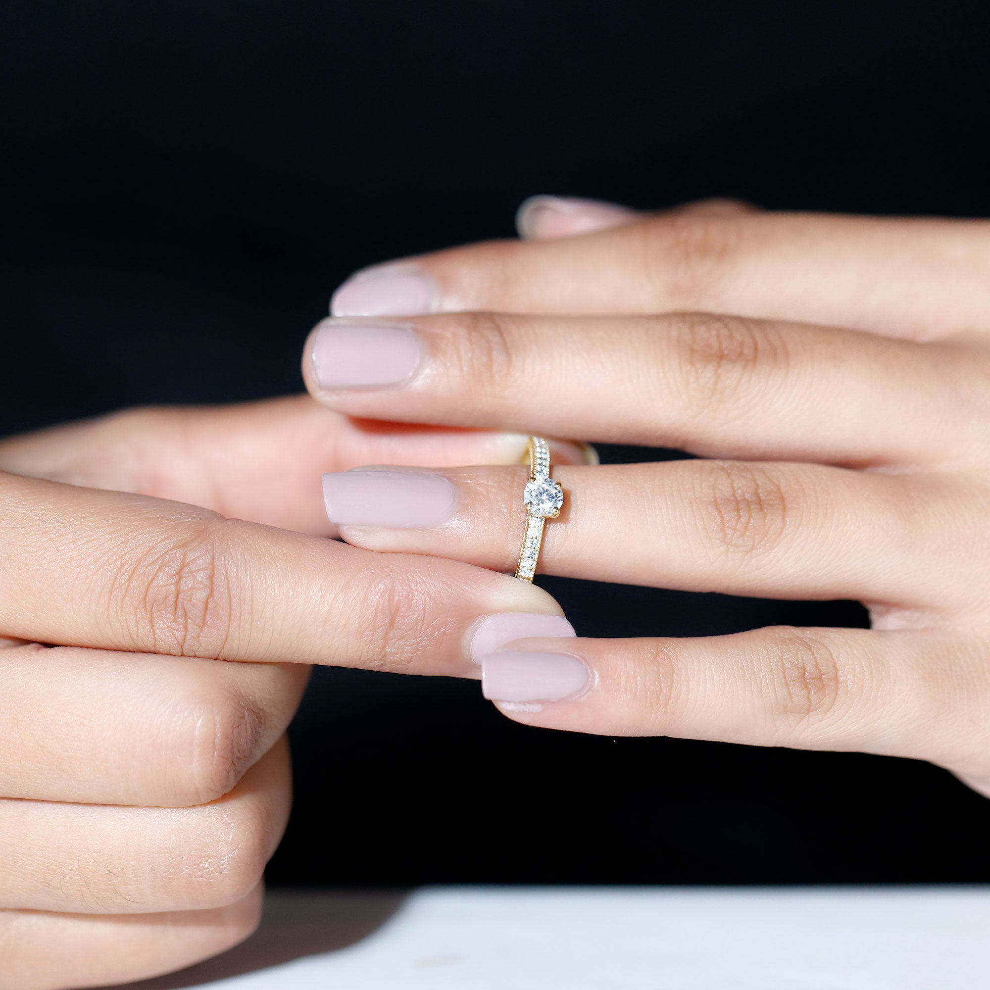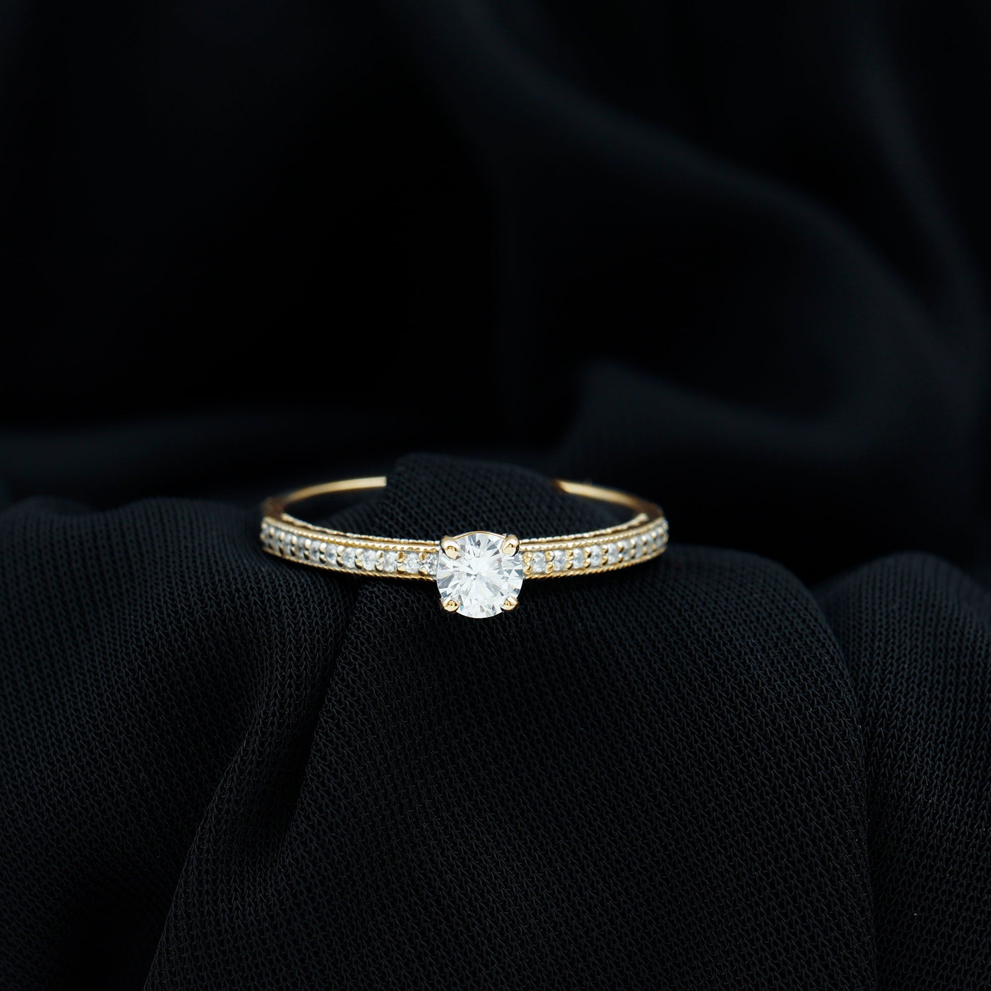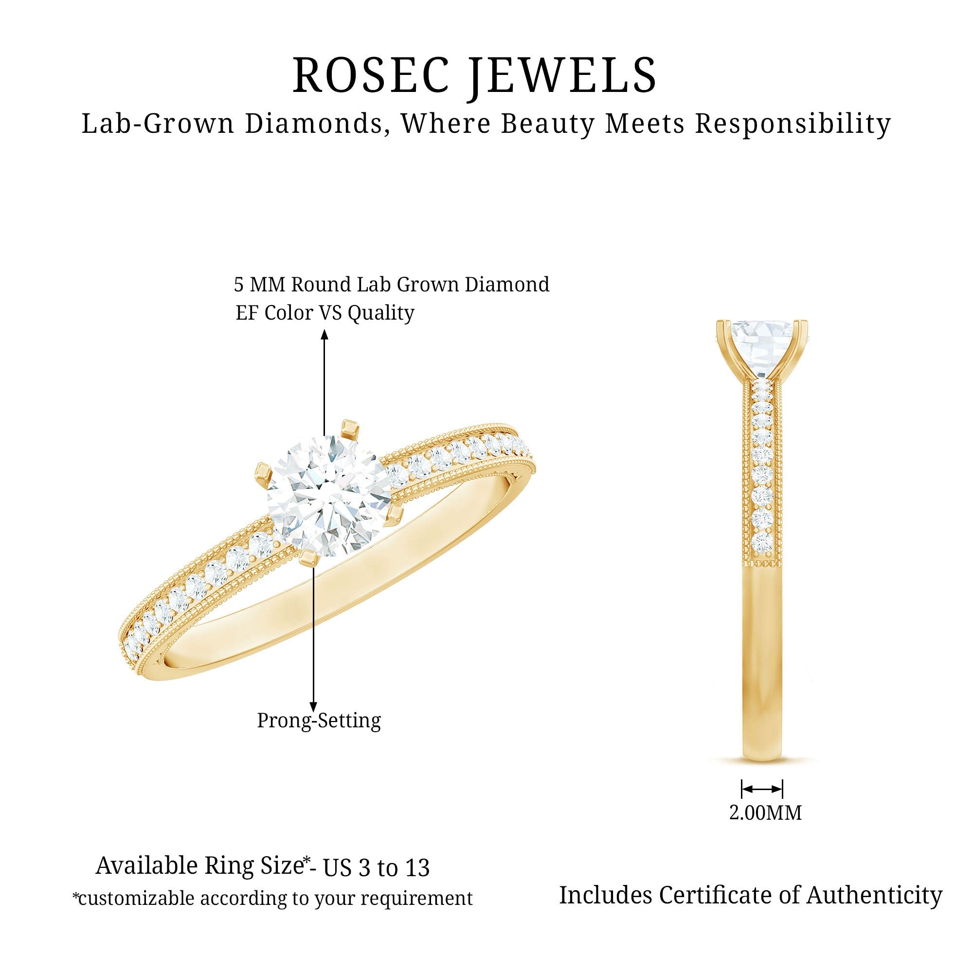 Pledge your commitment with this elegant Lab Grown Diamond Ring that is sure to take her breath away. At the center is the 5 MM Round Shaped Lab Grown Diamond in Square Prong Setting. Adding extra sparkle to the shank the Diamond accents shimmer brightly. The beaded details on the edges of the shank have a glamorous vintage style design that makes it perfect for the one who loves unique and timeless details. This scintillating Diamond Promise Ring adds a touch of color to any look. As a timeless elegance and embodying joy, this Promise Engagement Ring is perfect as an April birthday present or as a commitment ring that says it all.