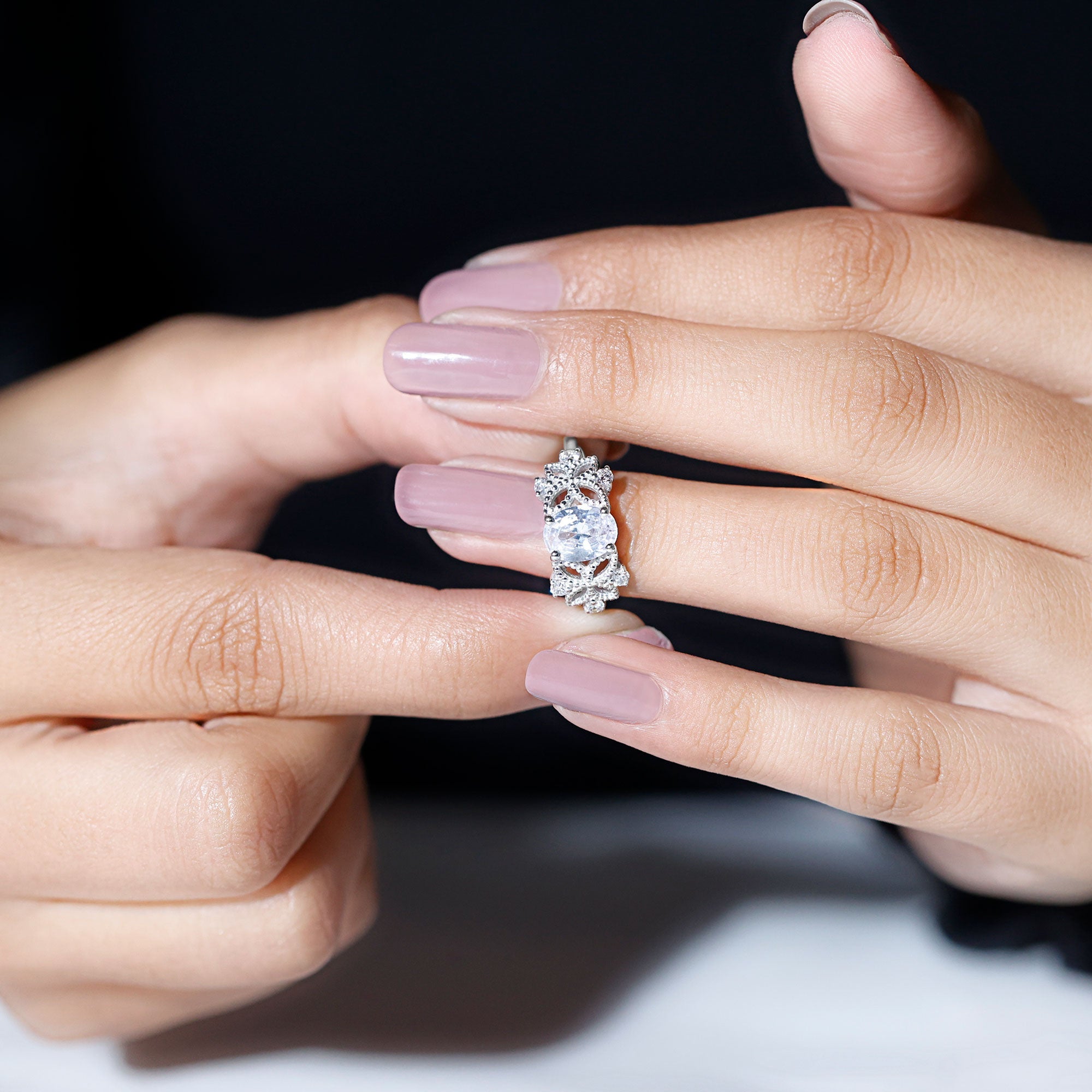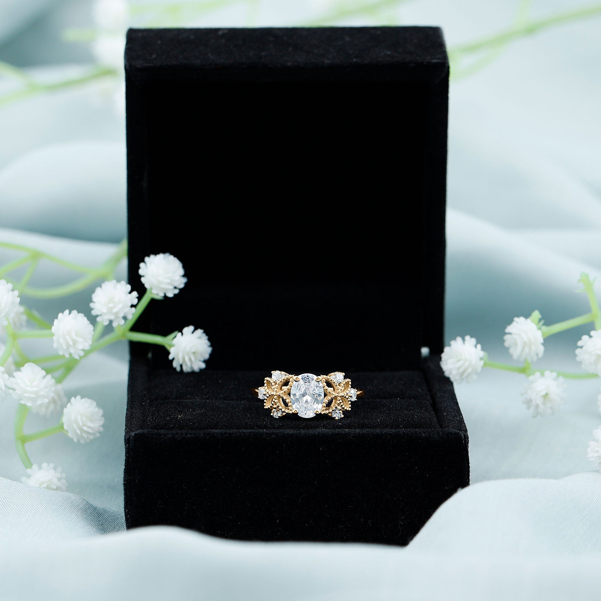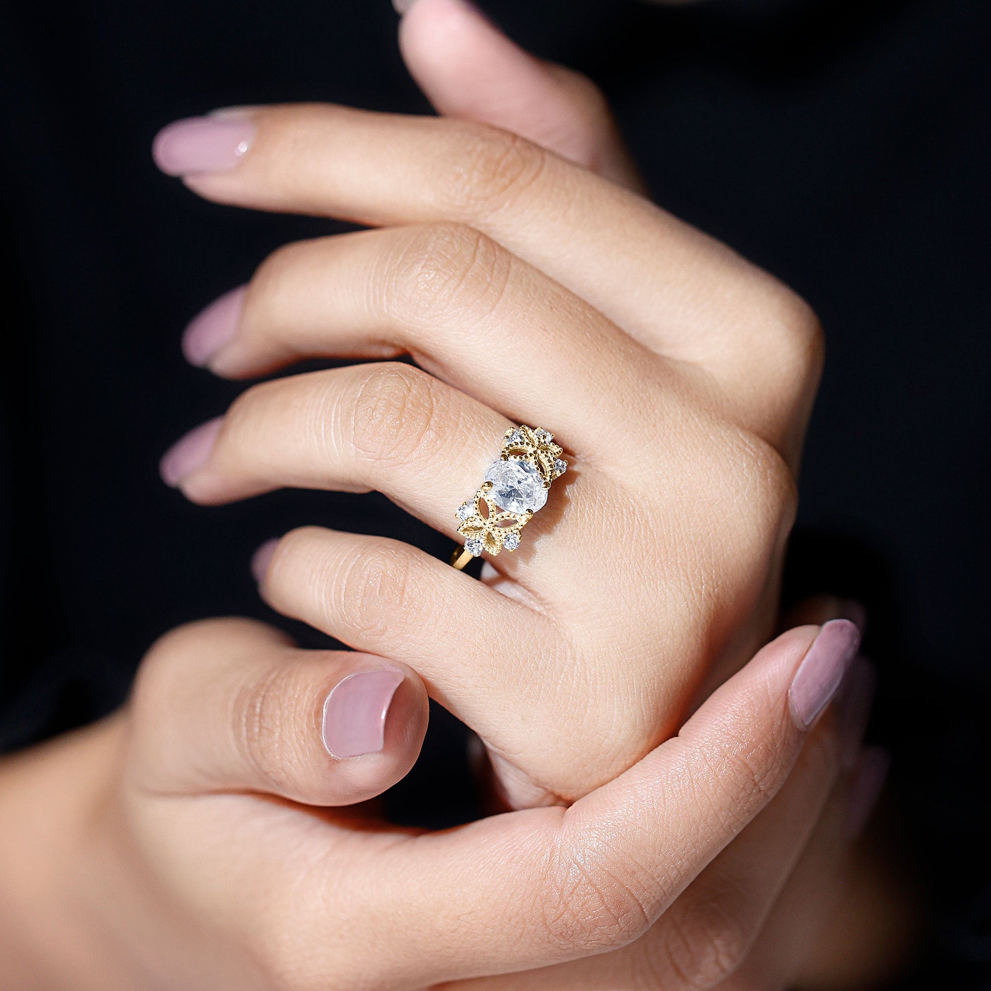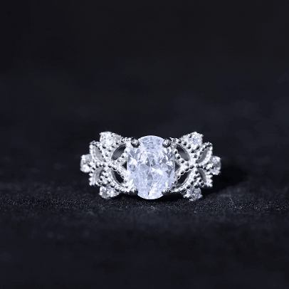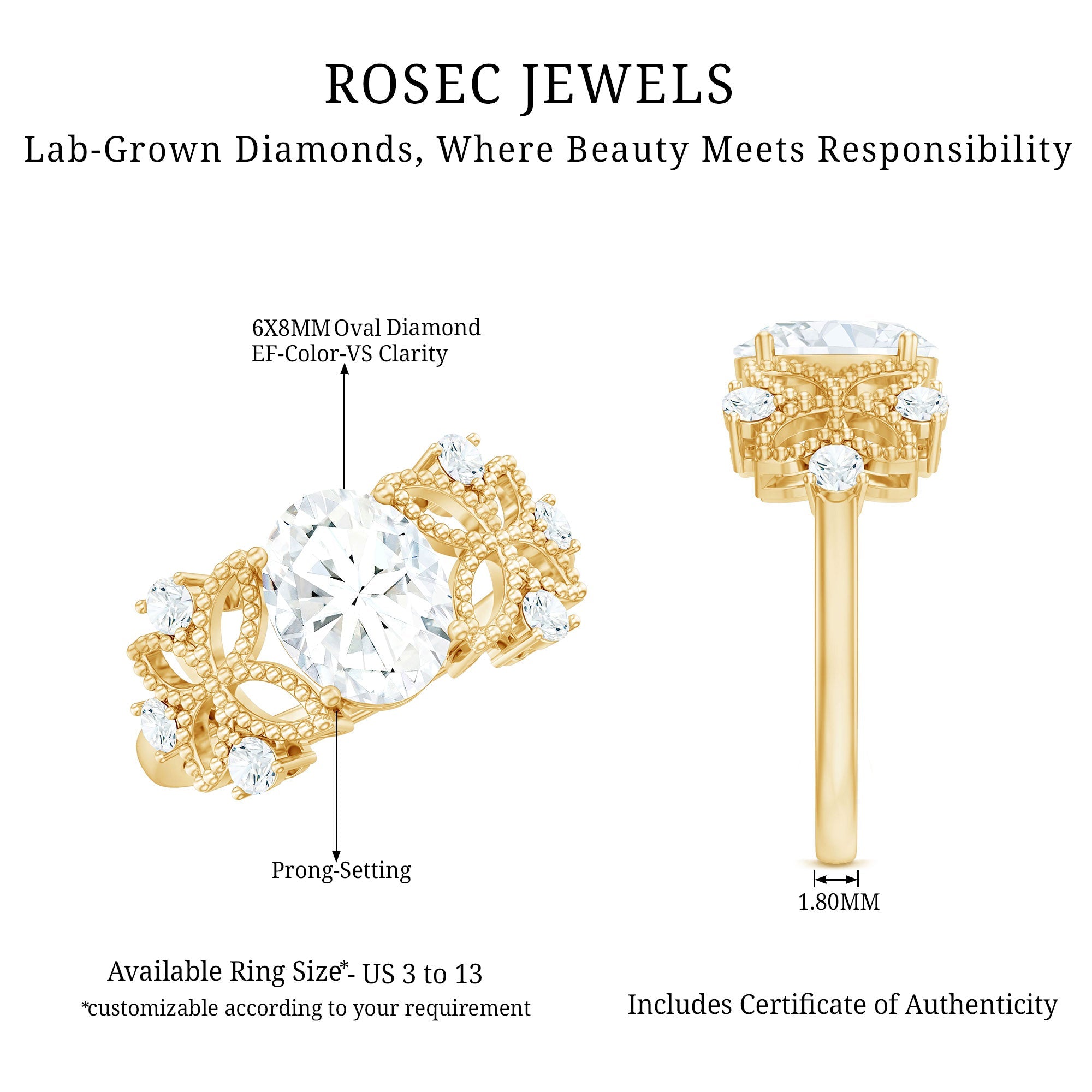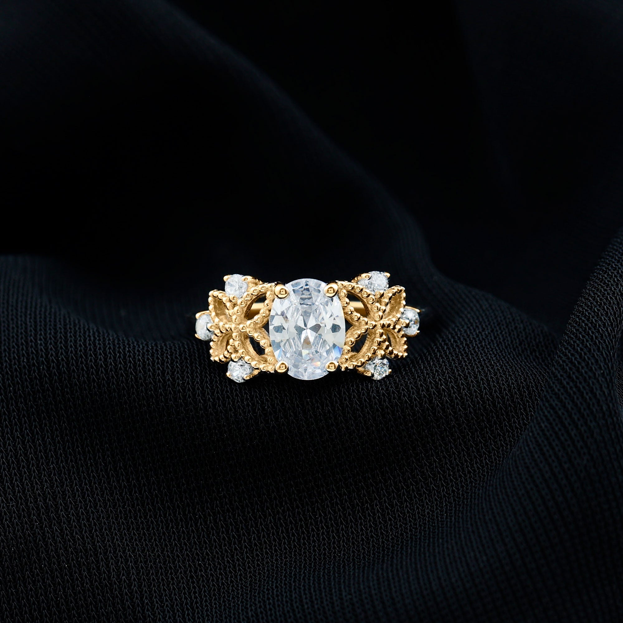 This Vintage Style Engagement Ring will give you a feeling of a treasured piece from the past, made to celebrate your future together. The design of this Art Deco Engagement Ring showcases a 6X8MM oval shaped lab created diamond set in prong setting. Flanking the centerpiece are intricately crafted beaded floral motifs, evoking the elegance of antique craftsmanship while capturing the beauty of nature. Nestled among the floral elements are round cut diamonds adding an extra touch of sparkle. Designed for brides who want a special piece that is full of romance but also has a hint of old-world charm and natures beauty. This Oval Diamond Solitaire Ring is a poetic expression of love that transcends time.