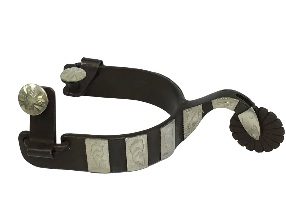 The AJ Tack Men's Swan Shank Antique Brown Spurs are a unique set of western show spurs in antique brown color. Featuring a hand-engraved silver overlay, one side showcases a beautiful swan motif, while the other side highlights a silver bars design. These spurs are crafted for a comfortable fit and are perfect for show or everyday riding.