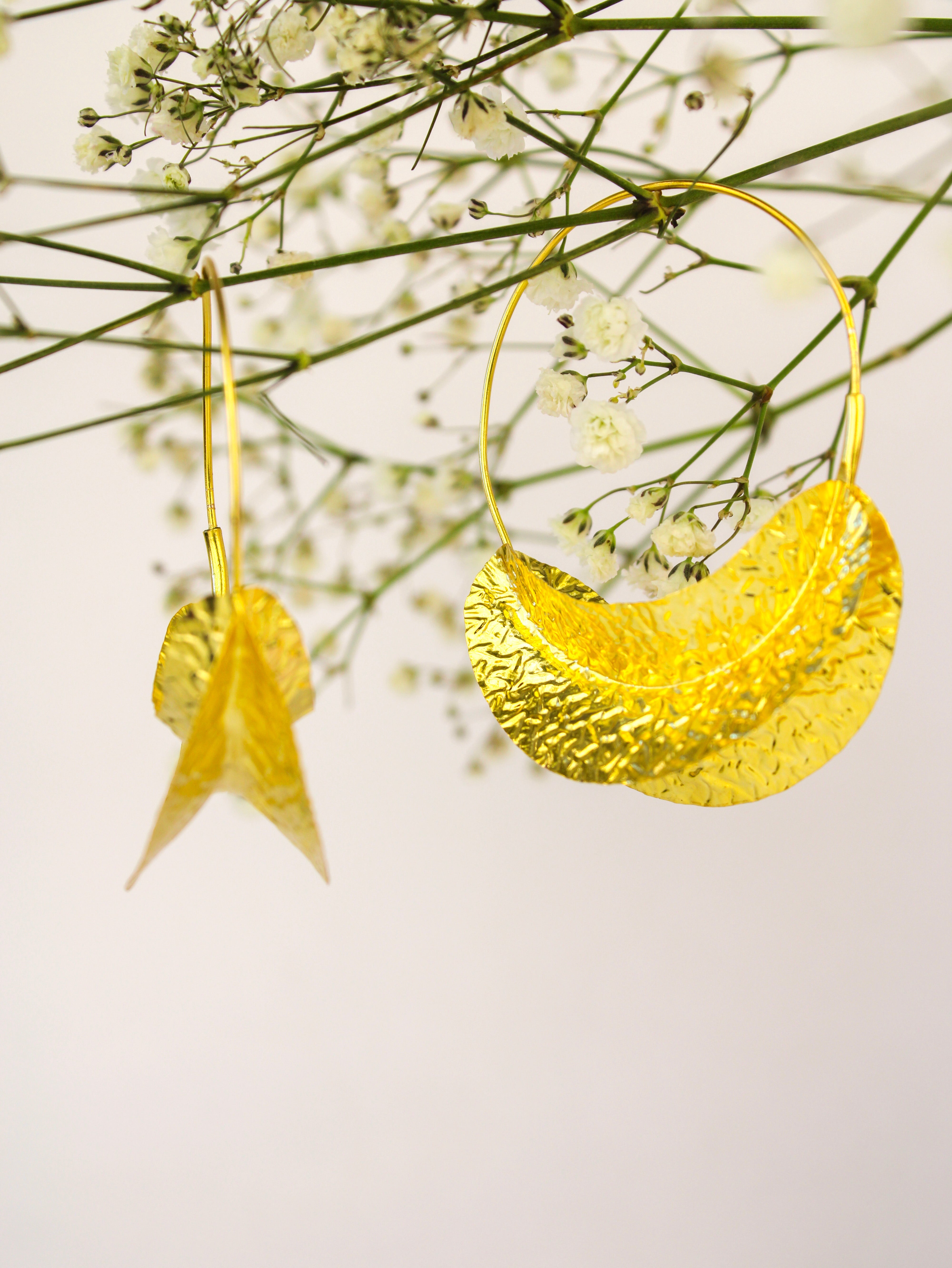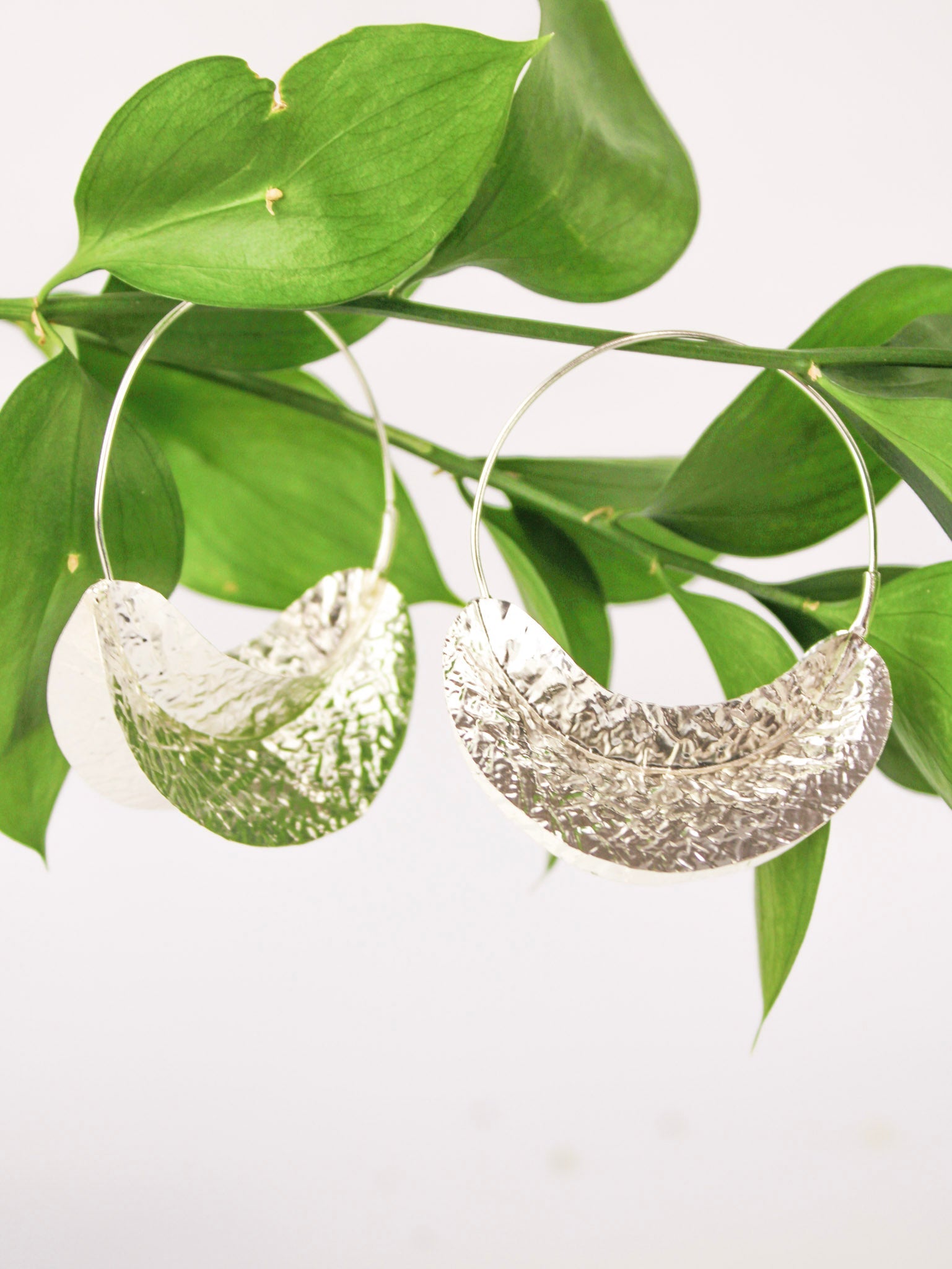 A unique hammered leaf-like design forms the base of a delicate hoop, creating a striking blend of elegance and artistry. The foil-like texture of the foliage catches the light beautifully, adding a touch of shimmer and intrigue to any look. Available in gold, rose gold, and silver, these lightweight hoops are perfect for enhancing both everyday styles and evening attire with an organic, sophisticated flair.