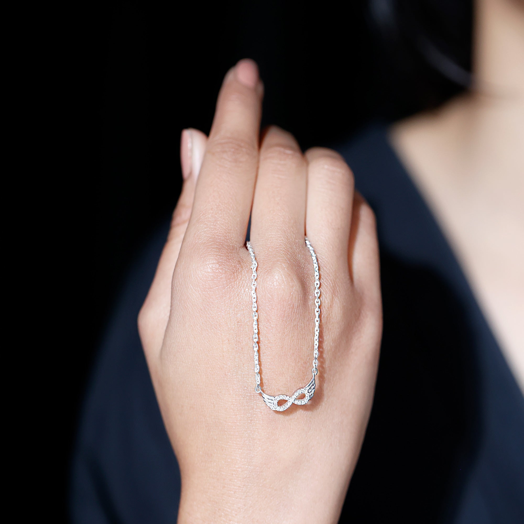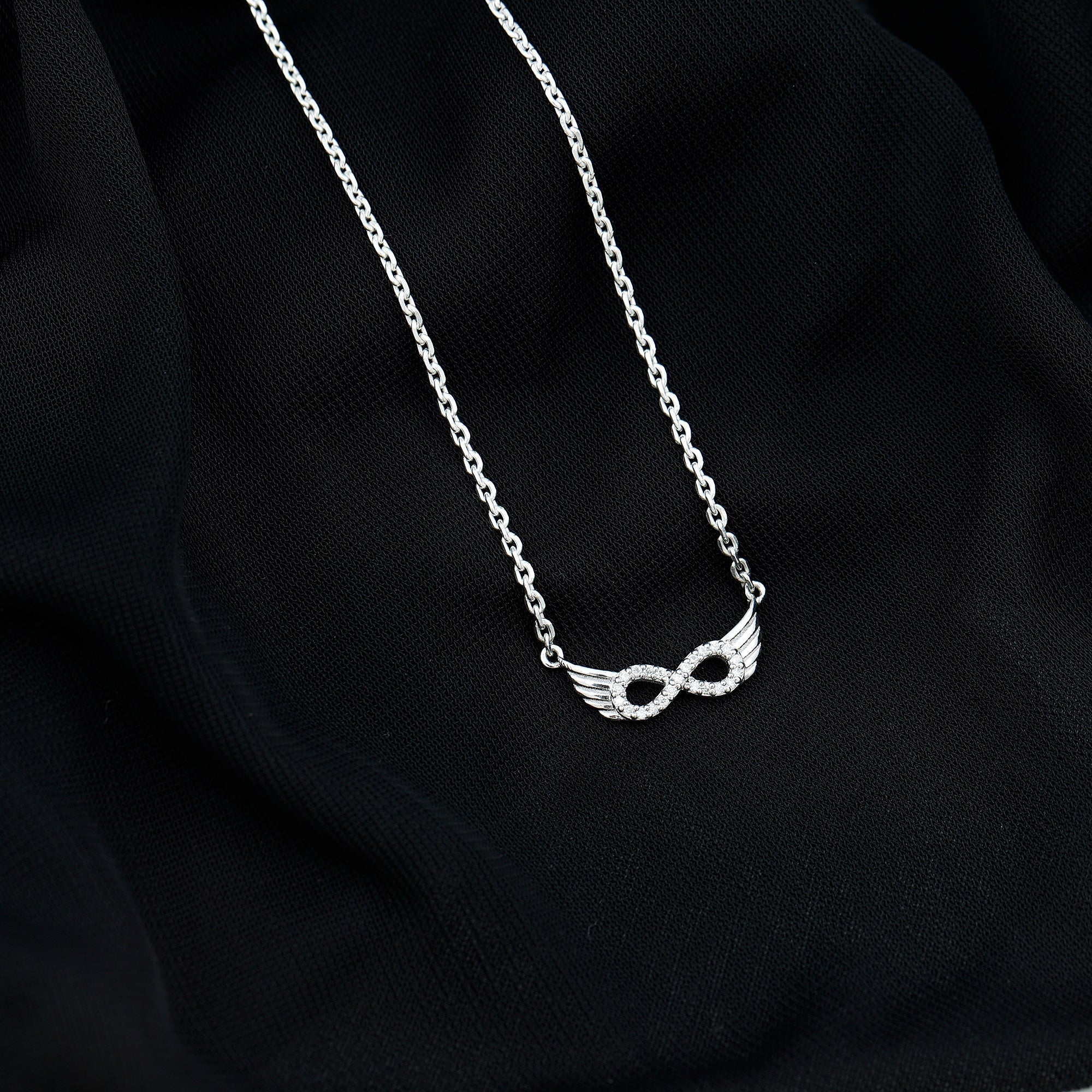Initiate the forever togetherness with this Moissanite Necklace crafted precisely with 14K White Gold Plated Silver. The pendant features an infinity charm studded with Moissanite stones in Pave Setting, and it is beautified with metallic wings. This Infinity Pendant dangles with a sturdy cable chain, which makes it perfectly sit on the neckline. This pendant is the perfect symbol of the unbreakable bond between you and your beloved, which makes it an ideal charm of love. The Wings Pendant will be delivered to you in a premium quality velvet pouch with a certificate of authenticity.