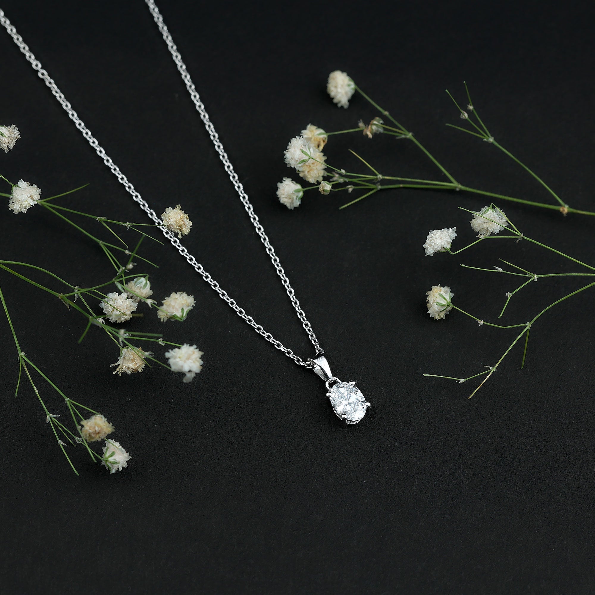 This Lab Grown Diamond Wedding Pendant is perfect to complete your look for the special day, precisely crafted with 14K White Gold Plated Silver. The pendant features a 5X7 MM Oval Shape Lab Created Diamond securely placed in Prong Setting and accentuated with a standard bail. This Solitaire Pendant beholds the classic shine of EF-VS Quality Synthetic Diamond. This single stone necklace dangles in a sturdy cable which makes it beautifully sit on the neckline. This pendant can be a thoughtful gift for your lady on the occasion of Valentines Day.