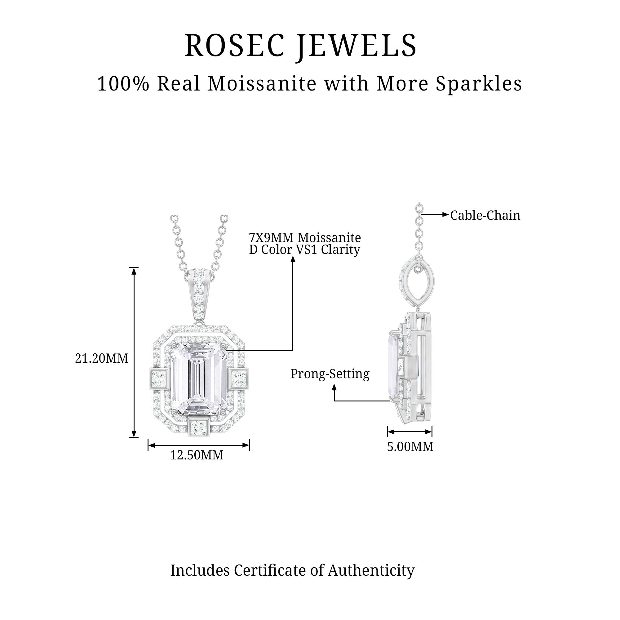 With the inspiration of vintage art, this Moissanite Pendant is handcrafted to adorn your neckline. This Art Deco Pendant is crafted with a 7X9 MM Emerald Cut Moissanite of D-VS1 Quality securely placed in Prong Setting that reflects a subtle shimmer. The center stone is surrounded by a double halo of smaller Moissanite, which enhances the appearance of the pendant as the petite stones catch the light in flashes and shine adorably. This Halo Necklace is accentuated with a petite round diamond Halo and studded bail, the pendant dangles with a sturdy cable chain that makes it beautifully sit on the neckline. This Emerald Cut Necklace will be shipped to you in premium packaging with a certificate of authenticity.