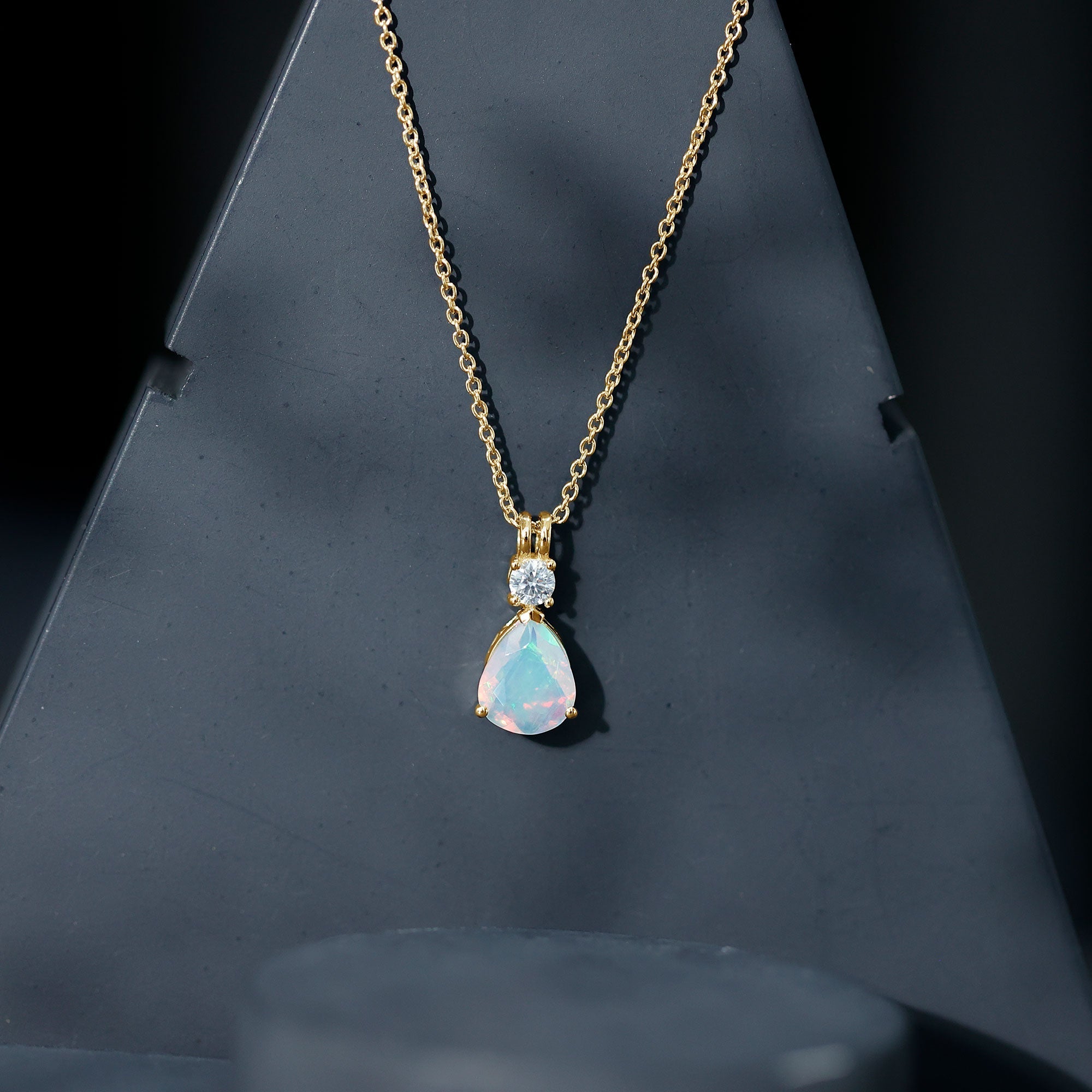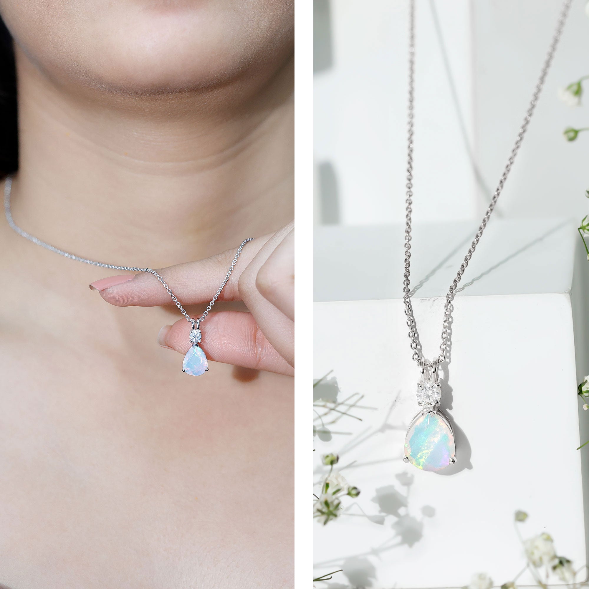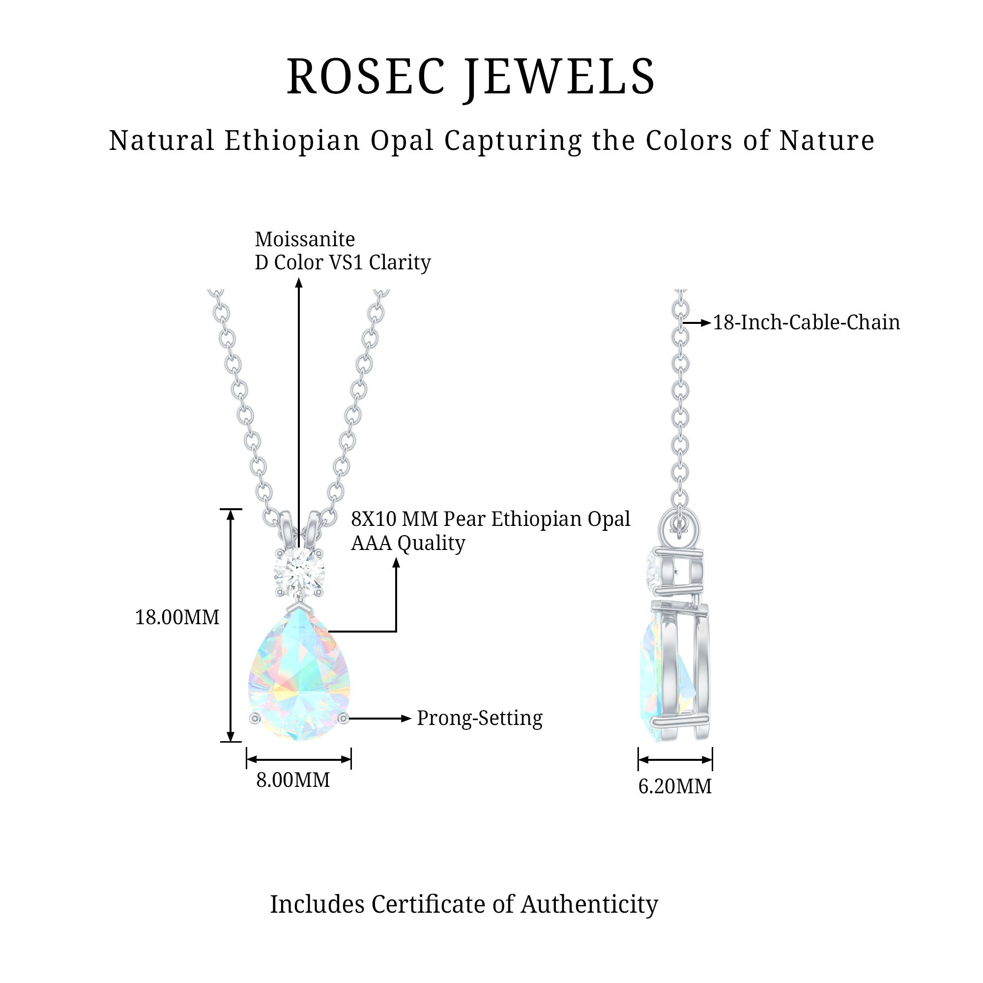 Embrace the colorful allures with this Rainbow Opal Pendant. It features an 8X10 MM Pear Shape Ethiopian Opal adorned with 4 MM Round Shape Moissanite at the top. This Teardrop Necklace dangles in a sturdy cable chain which makes it perfectly sit on the neckline. The pendant beholds the classic shine of AAA Quality Ethiopian Opal that makes you the center of attraction in the crowd. The pendant is handcrafted with 14K White Gold Plated Silver. Present this pendant to your beloved on a special occasion and witness a priceless reaction from her.