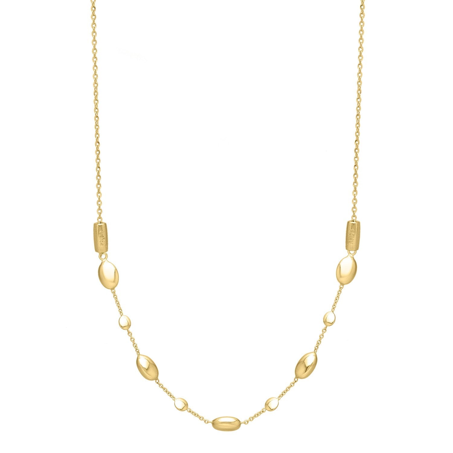 Enhance your look with this 14k yellow gold puff pebble necklace. This eye-catching design features five larger polished beads interspersed with four smaller ones. Its adaptable length allows for versatile styling options on any occasion. Blending classic appeal with modern versatility, it’s the ultimate finishing touch for any look.