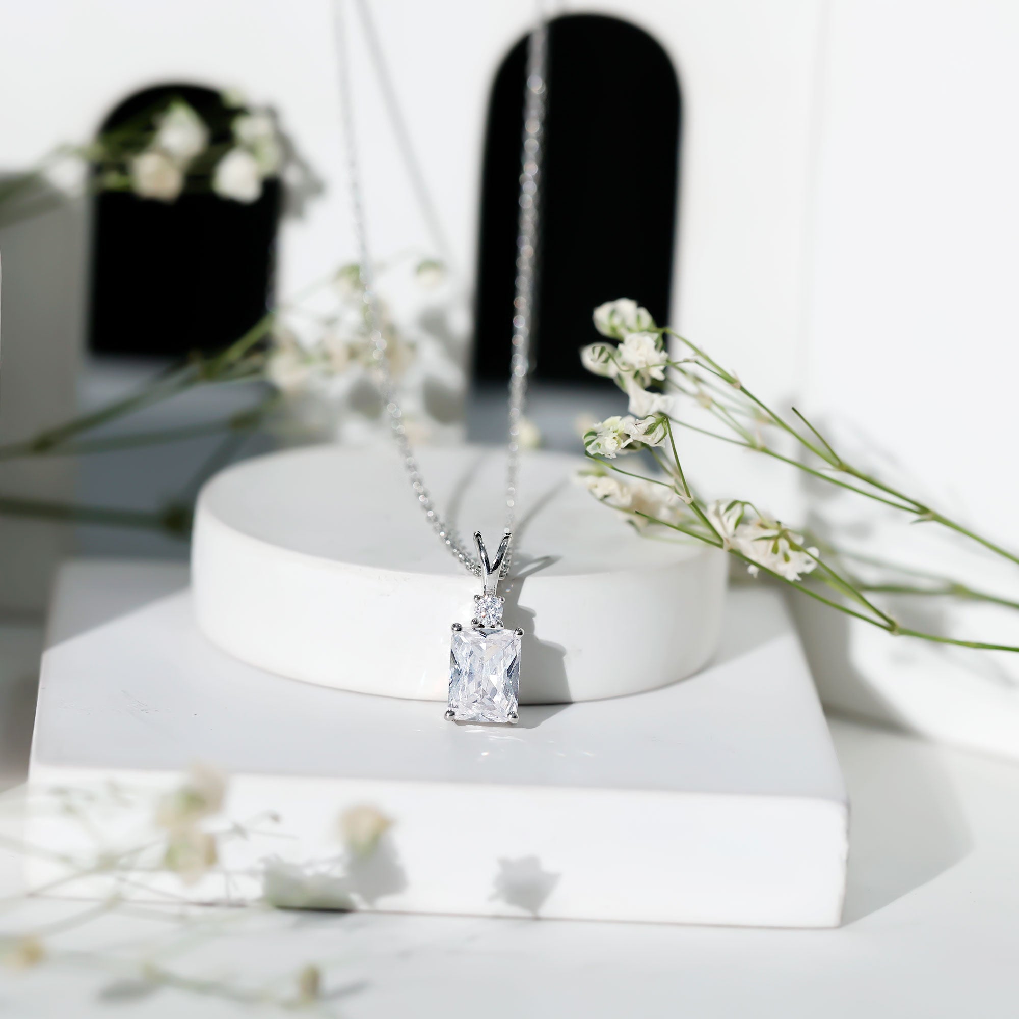 Certified 6X8 MM Emerald Cut CZ Diamond Solitaire Necklace with Silver Chain