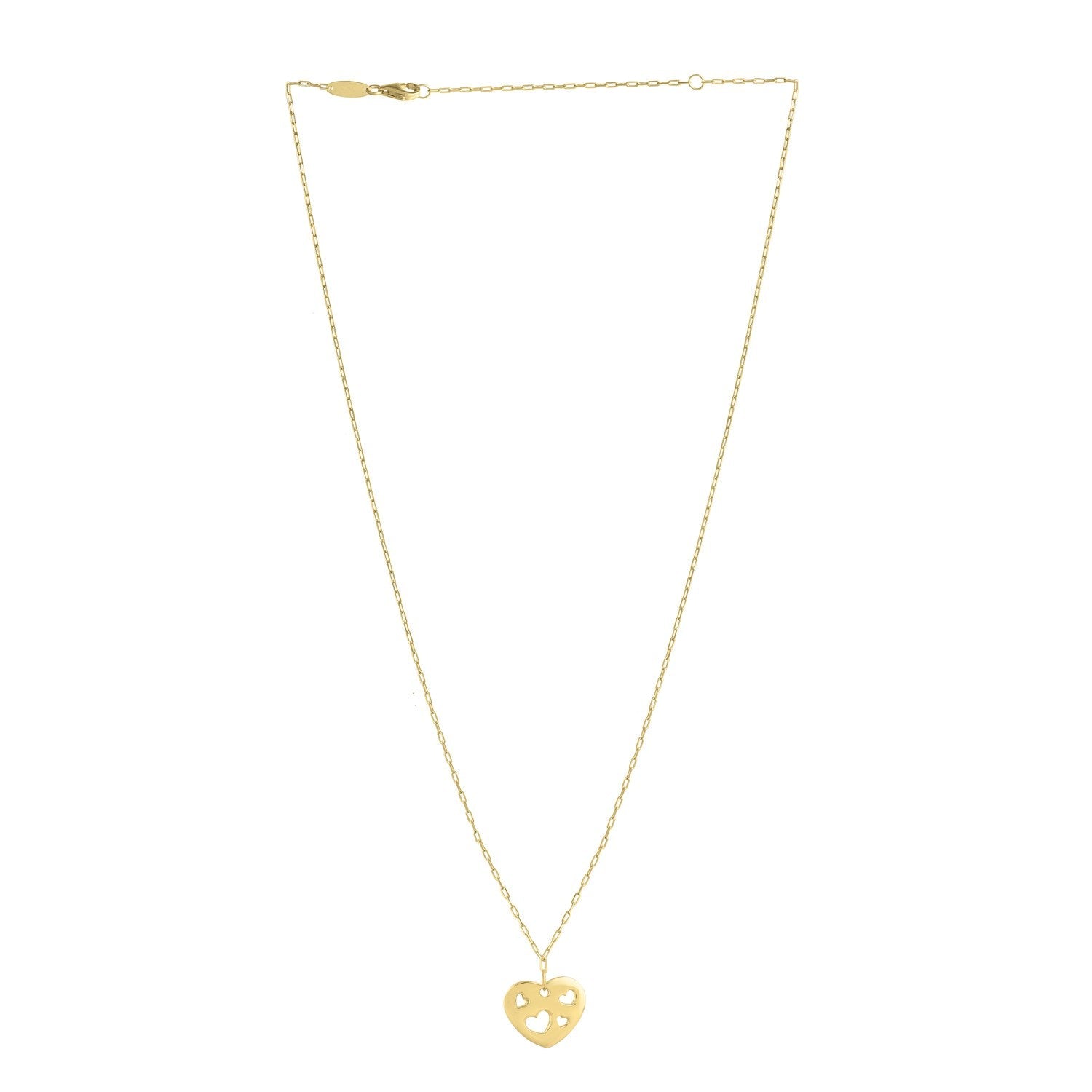 Love comes alive in this 14k yellow gold heart pendant on an 18 inches paperclip-link chain. Cutout hearts rest within a larger drop heart, creating a layered design that symbolizes affection. The harmony of shapes adds depth and dimension, making it a heartfelt tribute to meaningful connections. Secured with a spring ring clasp closure.