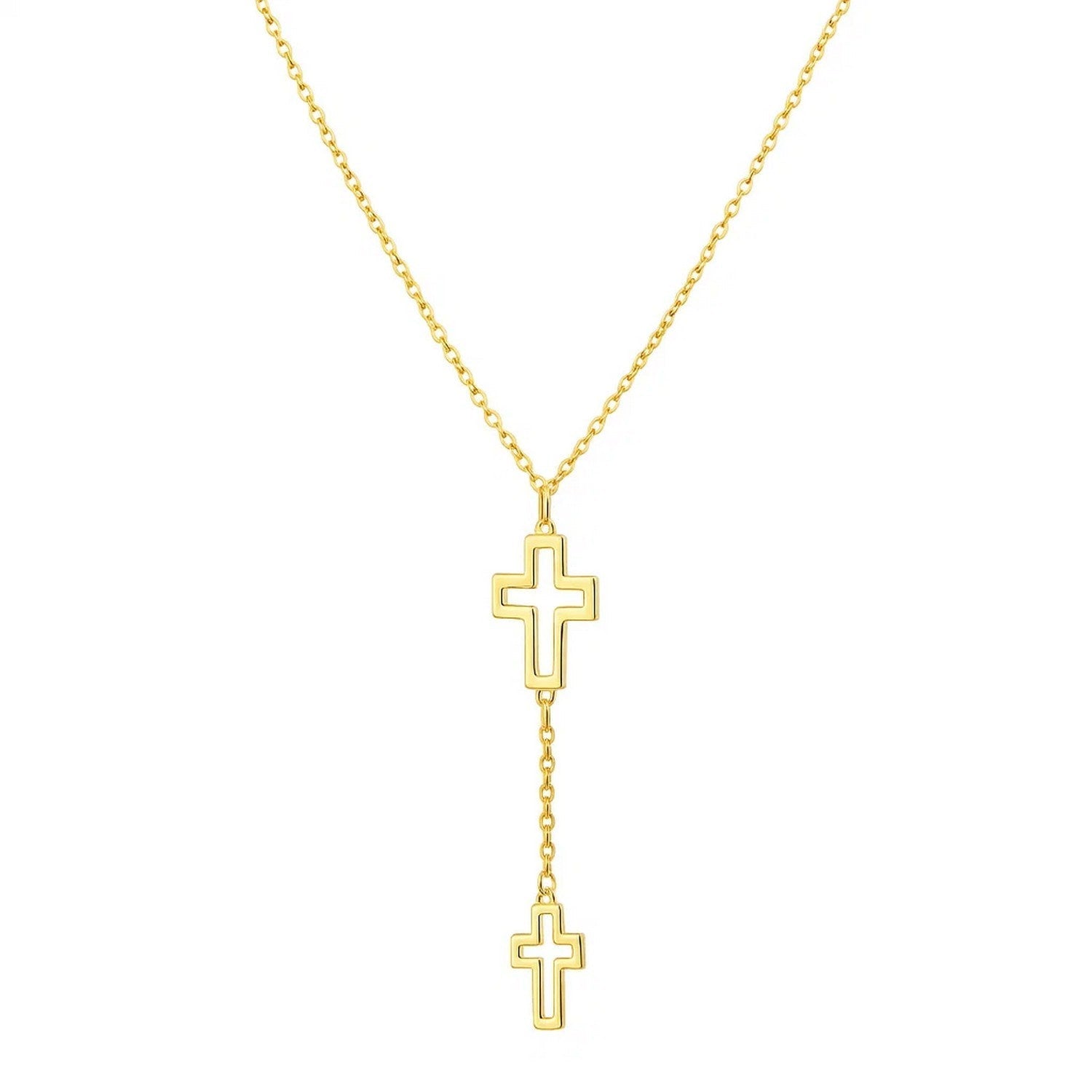 This 14K yellow gold double cross-drop necklace is a graceful expression of faith and style. Featuring two finely outlined cross pendants that hang in perfect harmony, the design is both minimalist and meaningful. Suspended from a simple gold chain, this necklace embodies timeless elegance and is a subtle yet powerful symbol of devotion. Secured with a lobster clasp closure available in an 18 inches length.