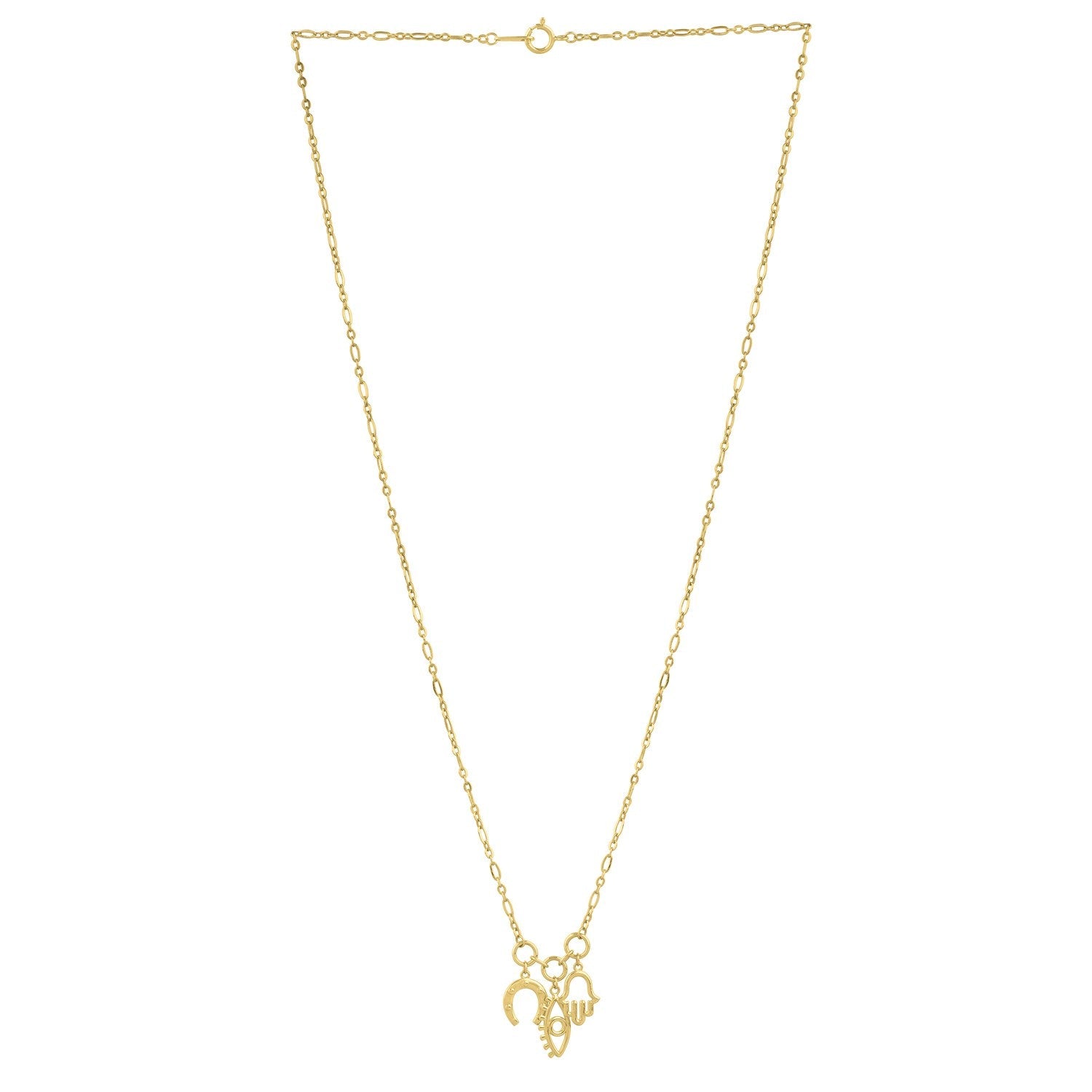 A trio of lucky charms — a polished Hamsa, an eye, and a horseshoe — take center stage in this 14k yellow gold drop-style necklace rendered with exquisite detail. The delicate 18 inches chain features an intricate link pattern, adding character. Thoughtfully combining symbolism and artistry, it’s a distinctive piece that reflects style and personal expression. Secured with a spring ring clasp closure.