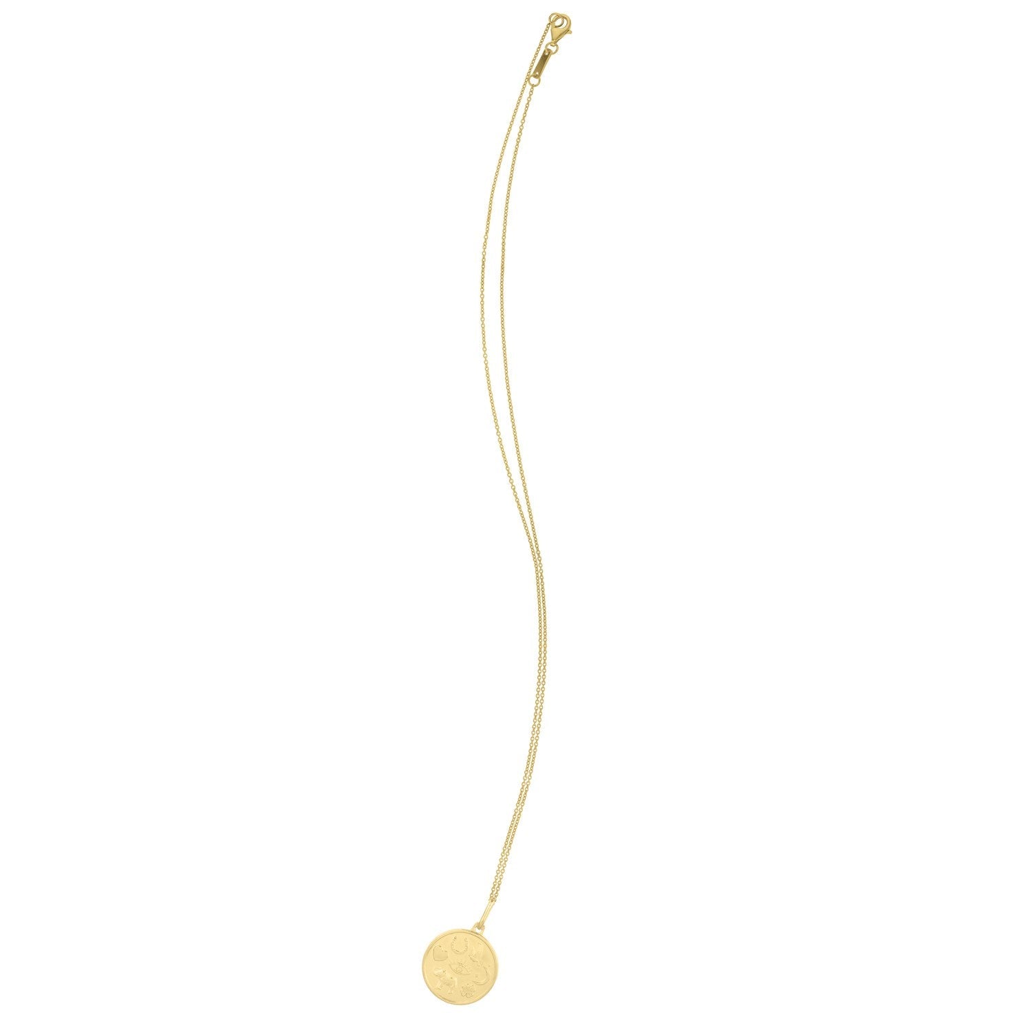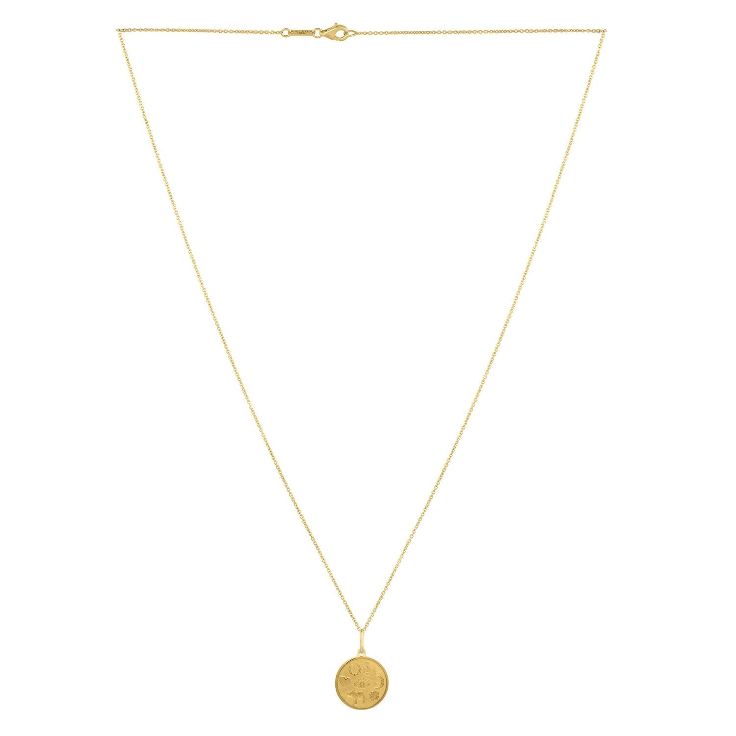 This 14k yellow gold necklace features a matte round pendant etched with a collection of lucky symbols. A horseshoe, moon and stars, elephant, dove, eye, heart, and four-leaf clover are intricately detailed, creating a charming design. The trimmed edge adds a lovely touch, while the 18 inches chain complements its distinctive style. It's a playful blend of charm and artistry, bringing luck to your look. Secured with a lobster clasp closure.