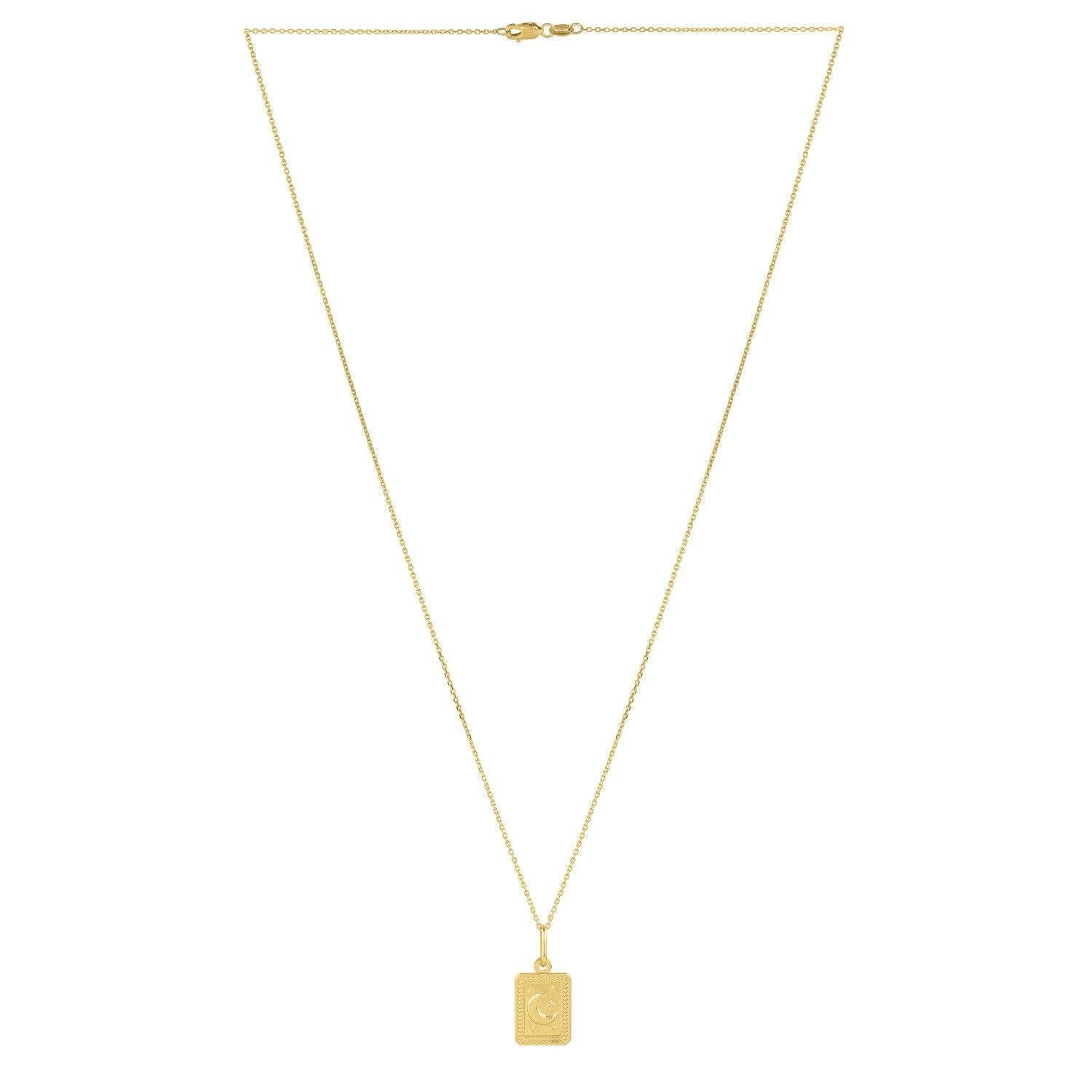 This 14k yellow gold pendant captures a crescent moon cradled by five stars, set within a rectangular frame with detailed edge embellishments. A wearable tribute to the mysteries of the cosmos, this gold-polished moon & stars talisman pendant comes complete with an 18 inches chain for effortless elegance. Secured with a lobster clasp closure.