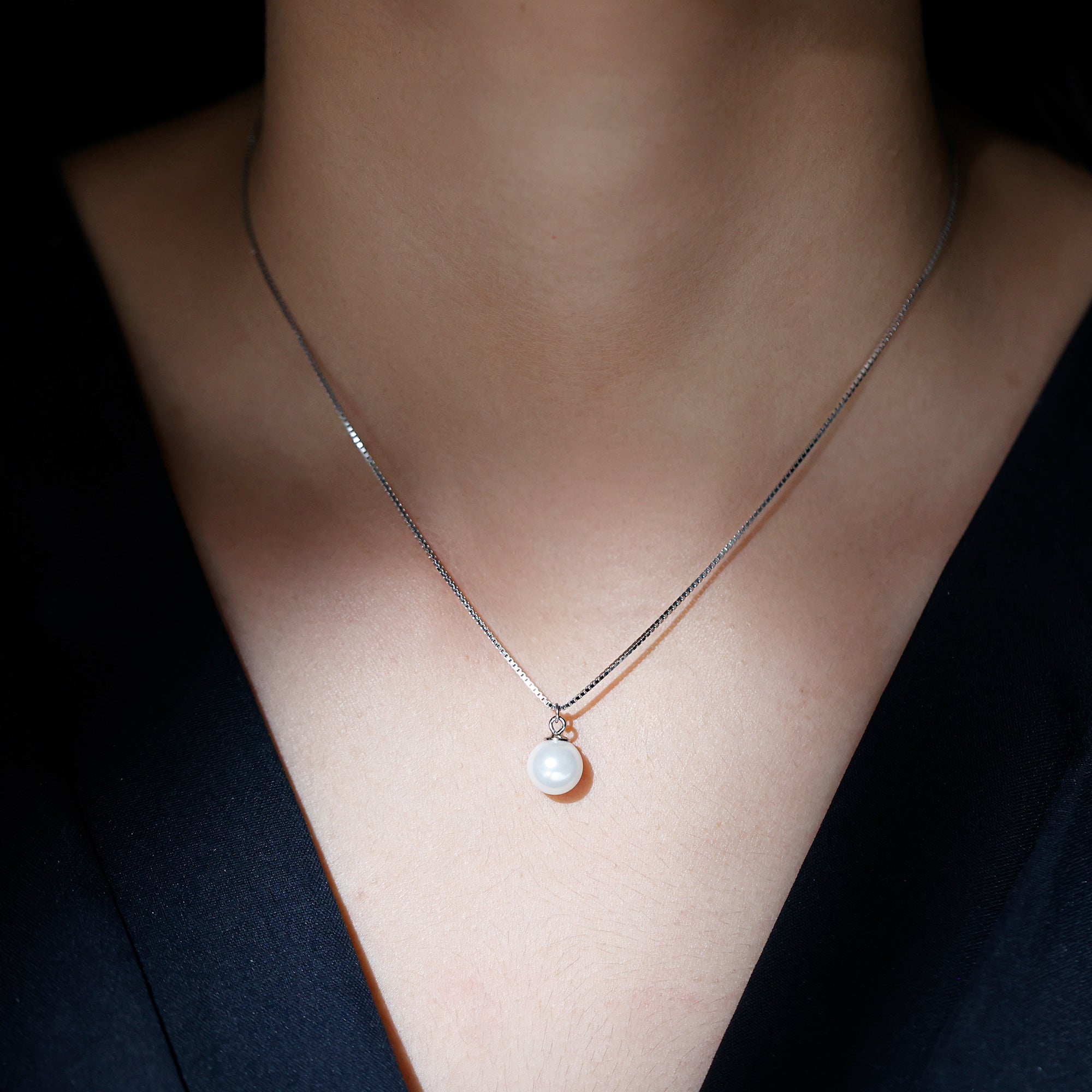 A representation of royalty, elegance, and timeless allure, this Freshwater Pearl Necklace radiates classic luxury in every aspect. Crafted with sophistication at its core, this Single Pearl Necklace showcases a lustrous 8 MM round Freshwater Pearl, delivering a timeless and opulent style that instantly enhances any ensemble. Handcrafted in 14k white gold plated silver, this White Pearl Necklace offers a brilliant and lasting finish to its design. The minimalist aesthetic allows the pearls purity to shine through, making it a versatile and enchanting accessory suitable for any event. Elevate your look with the subtle elegance of this Pearl Pendant Necklace, a testament to refined simplicity and lasting charm. It is suspended from a sturdy cable chain and secured with a lobster clasp, providing both style and assurance for wear from day to night. This Pearl Solitaire Necklace can also be effortlessly layered with a longer chain or worn solo as a chic statement piece. Perfect for weddings, festive celebrations, or as a signature everyday accessory, this One Pearl Necklace embodies refined taste, poised beauty, and graceful tradition.