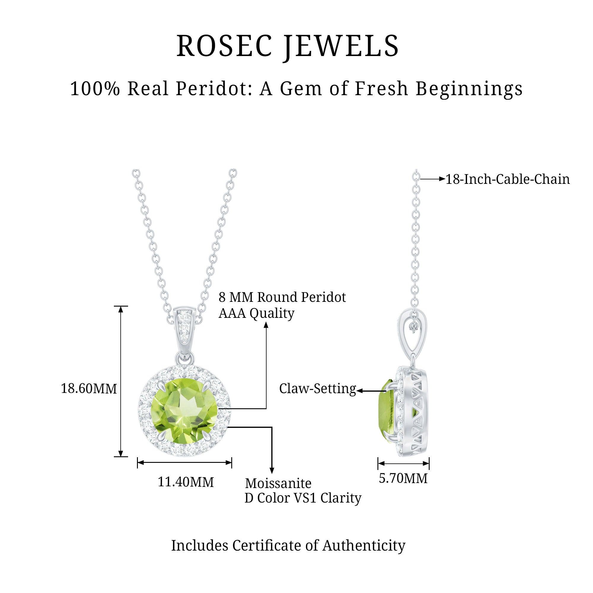 Natural Peridot and Moissanite Halo Necklace with Silver Chain ‐ AAA / 92.5 Sterling Silver