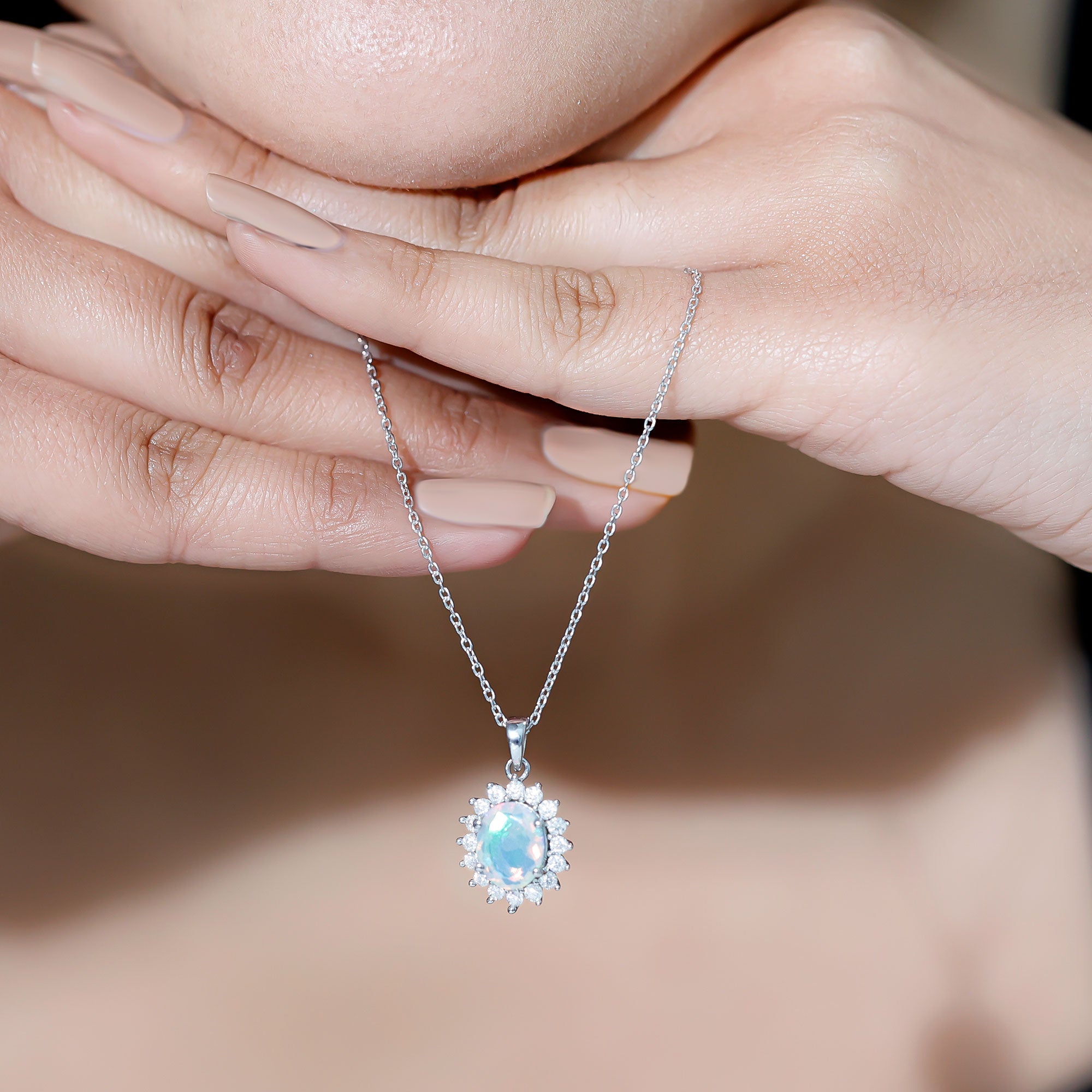 Oval 7X9 MM Rainbow Opal Moissanite Halo Pendant Necklace