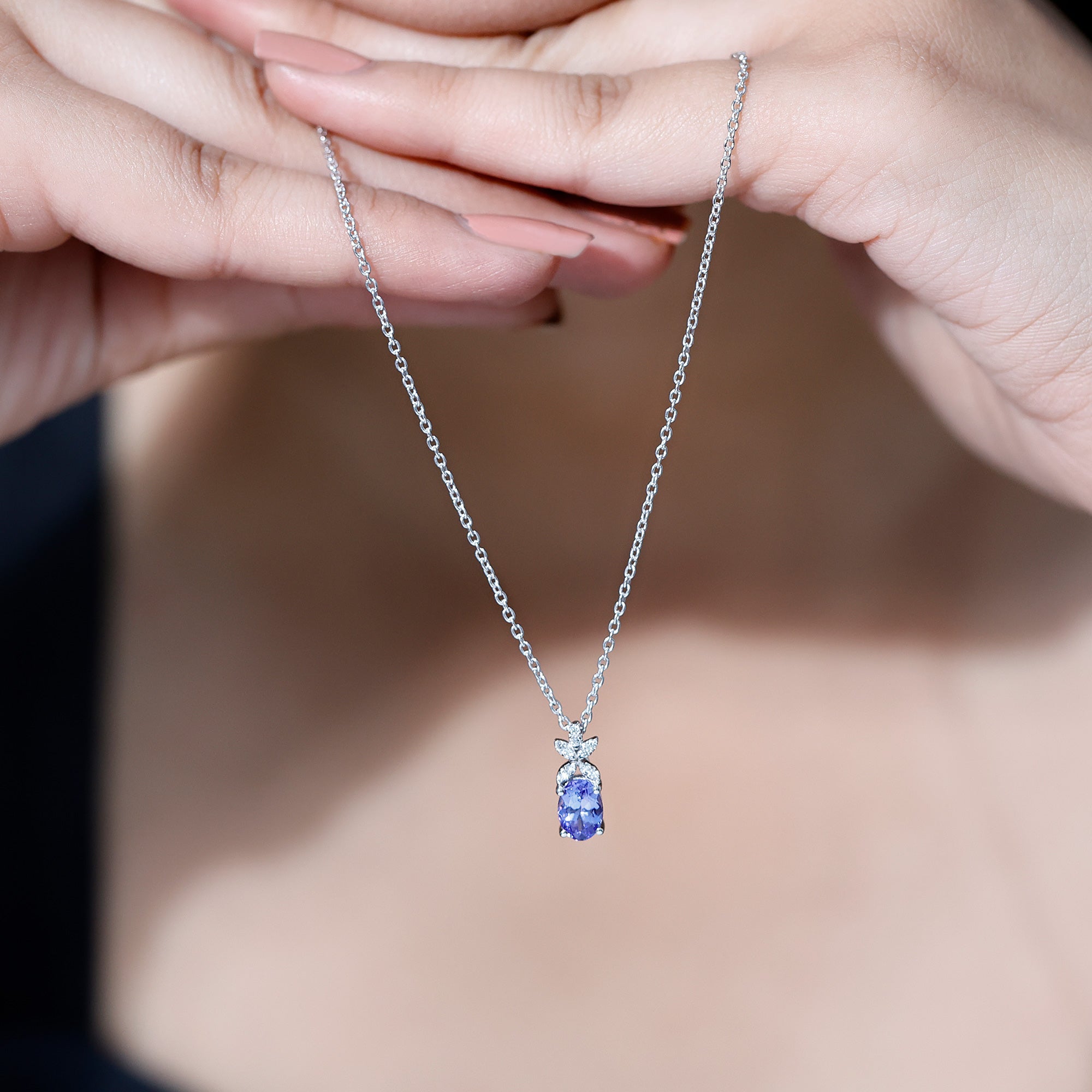 Bring a touch of elegance and charm to your look with this beautifully handcrafted Tanzanite Flower Necklace. Made in 14K white gold plated silver, this delicate piece features a captivating 5X7 MM oval shaped Tanzanite as the centerpiece. Known for its vibrant violet-blue hue, the Tanzanite radiates a soothing, luxurious glow that instantly draws attention. Above the center stone is a graceful floral design, crafted with care and set with sparkling lab grown diamonds. Each petal is shaped to perfection, creating a soft and feminine silhouette that enhances the overall beauty of this Tanzanite and Diamond Necklace. The diamonds catch the light from every angle, adding just the right amount of brilliance to complement the rich tone of the Tanzanite. The combination of nature inspired design and fine craftsmanship gives this Tanzanite Necklace a timeless appeal, making it ideal for both everyday elegance and special occasions. Suspended on a silver chain, this Drop Pendant is lightweight, comfortable to wear, and made to last. Add this stunning piece to your wardrobe today and bring effortless sophistication to your jewelry collection.