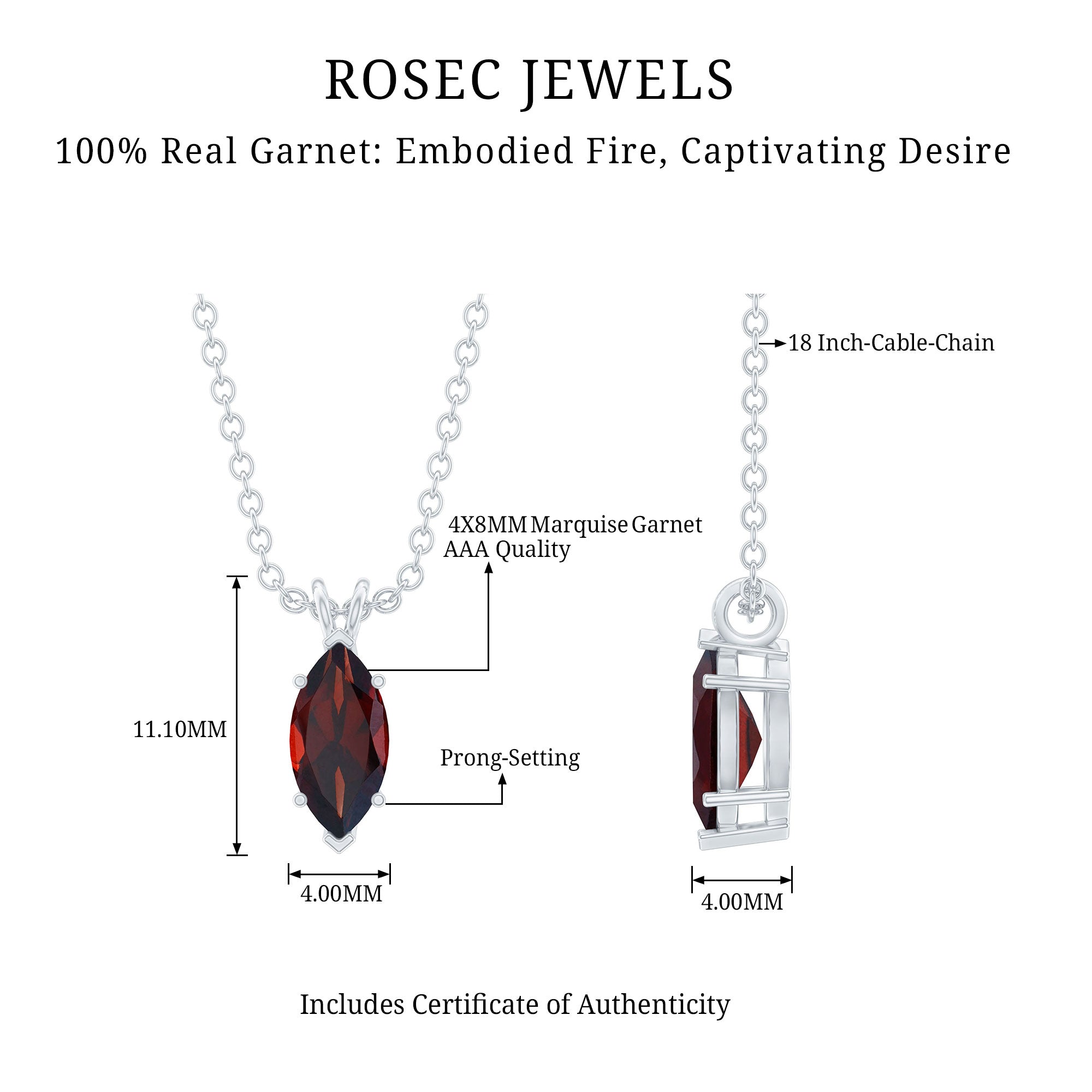 This Garnet Pendant Necklace is precisely crafted with 14K White Gold Plated Silver. The pendant features a 4X8 MM Marquise Shape securely placed in Prong Setting. The Solitaire Pendant has a Rabbit Ear Bail through which a cable chain is passing through and let the Real Garnet dangles on neckline. The Marquise Necklace dazzles with the classic shine of AAA Quality Garnet, which makes it perfect for completing the look for a special occasion. This Big Stone Necklace will be delivered to you in a velvet pouch for safe and secure storage, along with the certificate of authenticity.