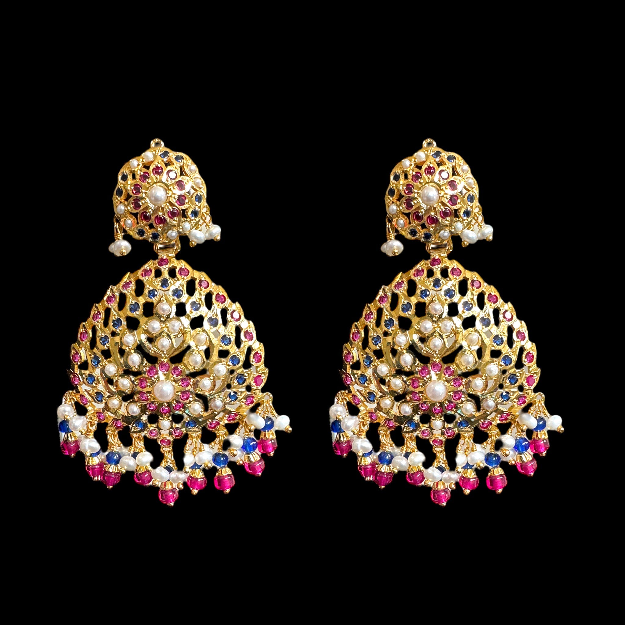 made using fresh water pearls with ruby and sapphire stones