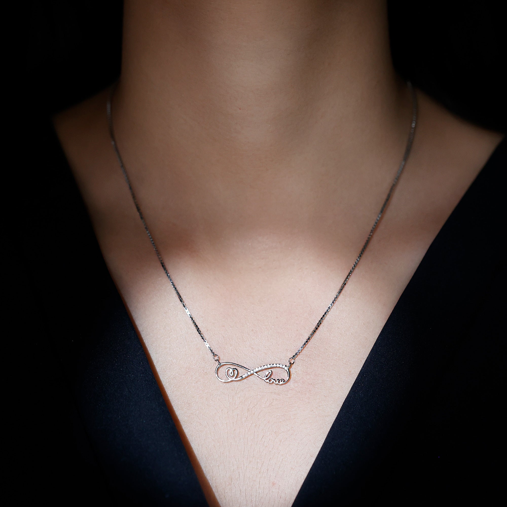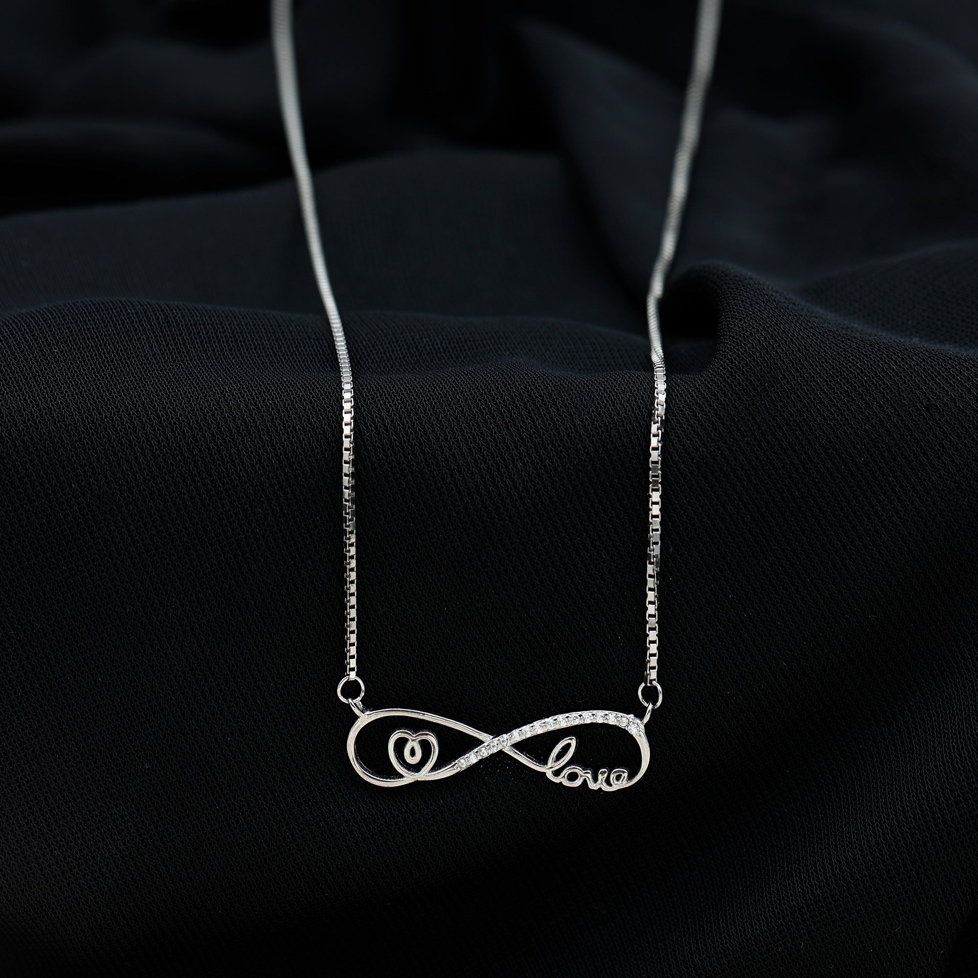 Mark the beginning of forever togetherness with this CZ Infinity Pendant crafted precisely with 14K White Gold Plated Silver. The pendant features an infinity frame partially embedded with Zircon securely placed in Pave Setting. This Heart Infinity Pendant beholds the classic shine of AAAA Quality Cubic Zirconia, which makes it perfect to complete the look for special days. This pendant features an open heart design along with a love initial. The pendant dangles in a sturdy cable chain that makes it perfectly sit on the neckline. This Zircon Pendant Chain will be delivered to you in a signature velvet pouch with the certificate of authenticity.