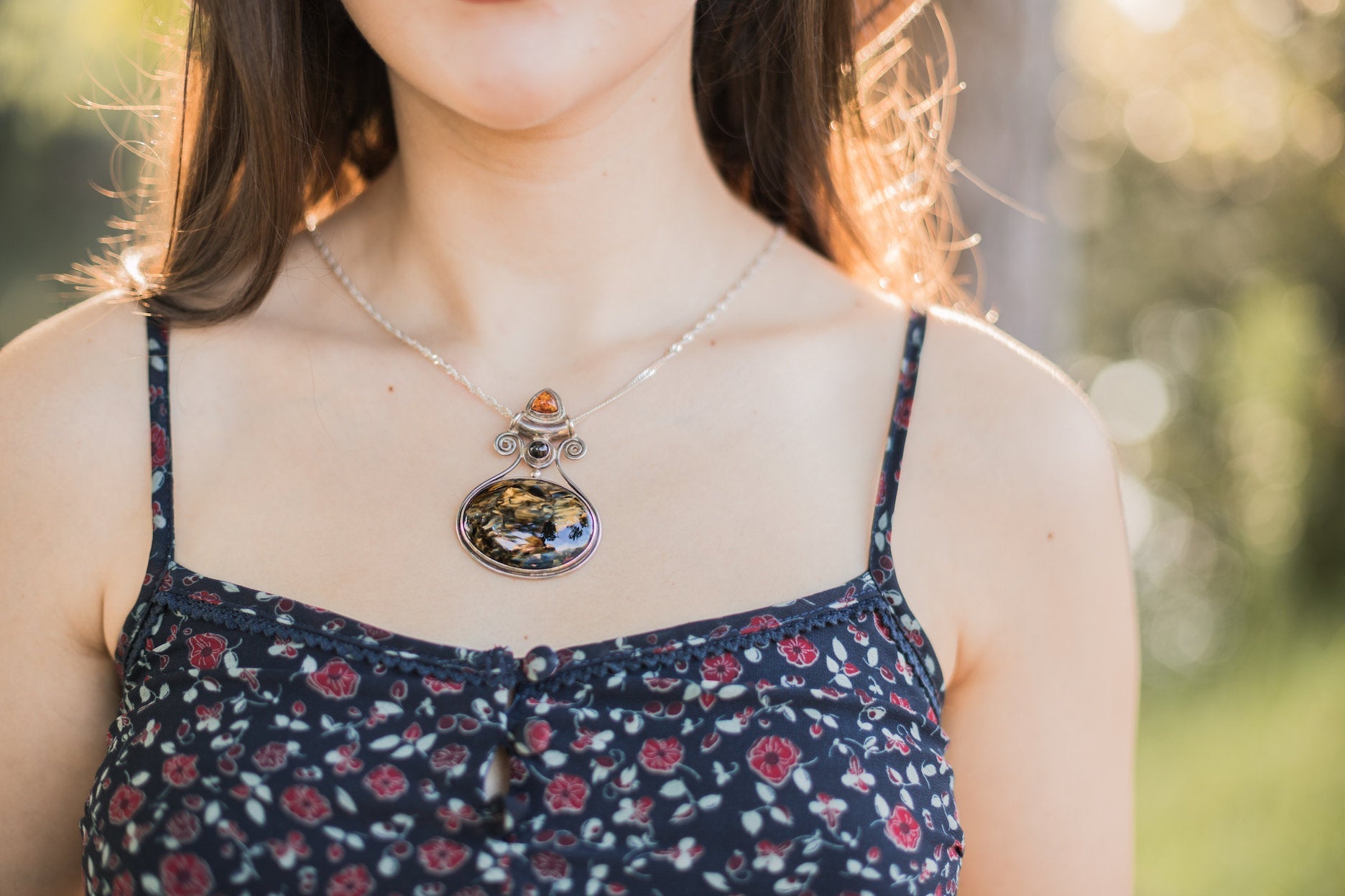 Vintage Designer SAJEN Large Blue Tigers Eye Amber Sterling Necklace