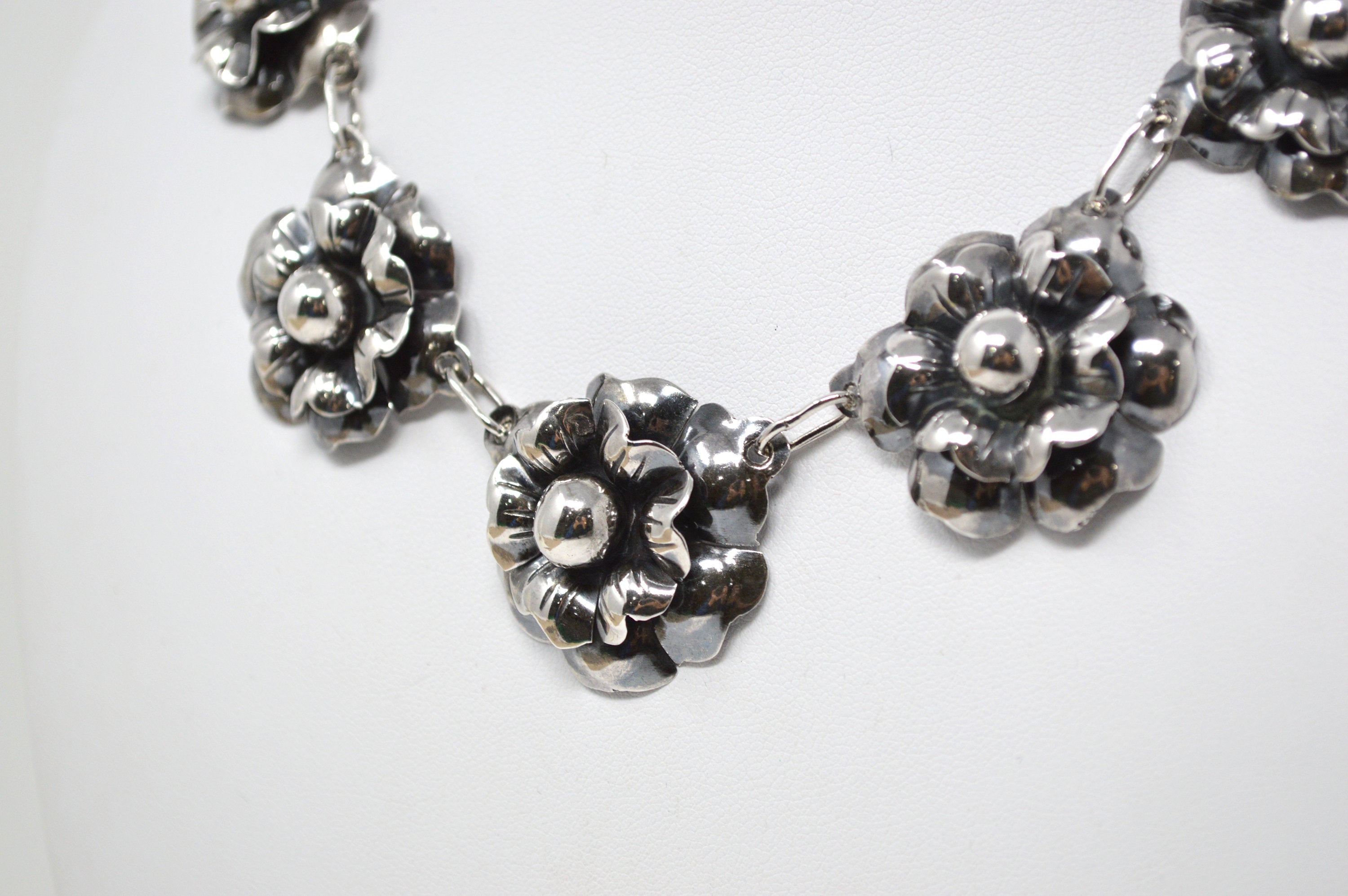 Vintage Mexico Sterling Silver Artisan 3D Oxidized Flower Motif Necklace 16 Inch