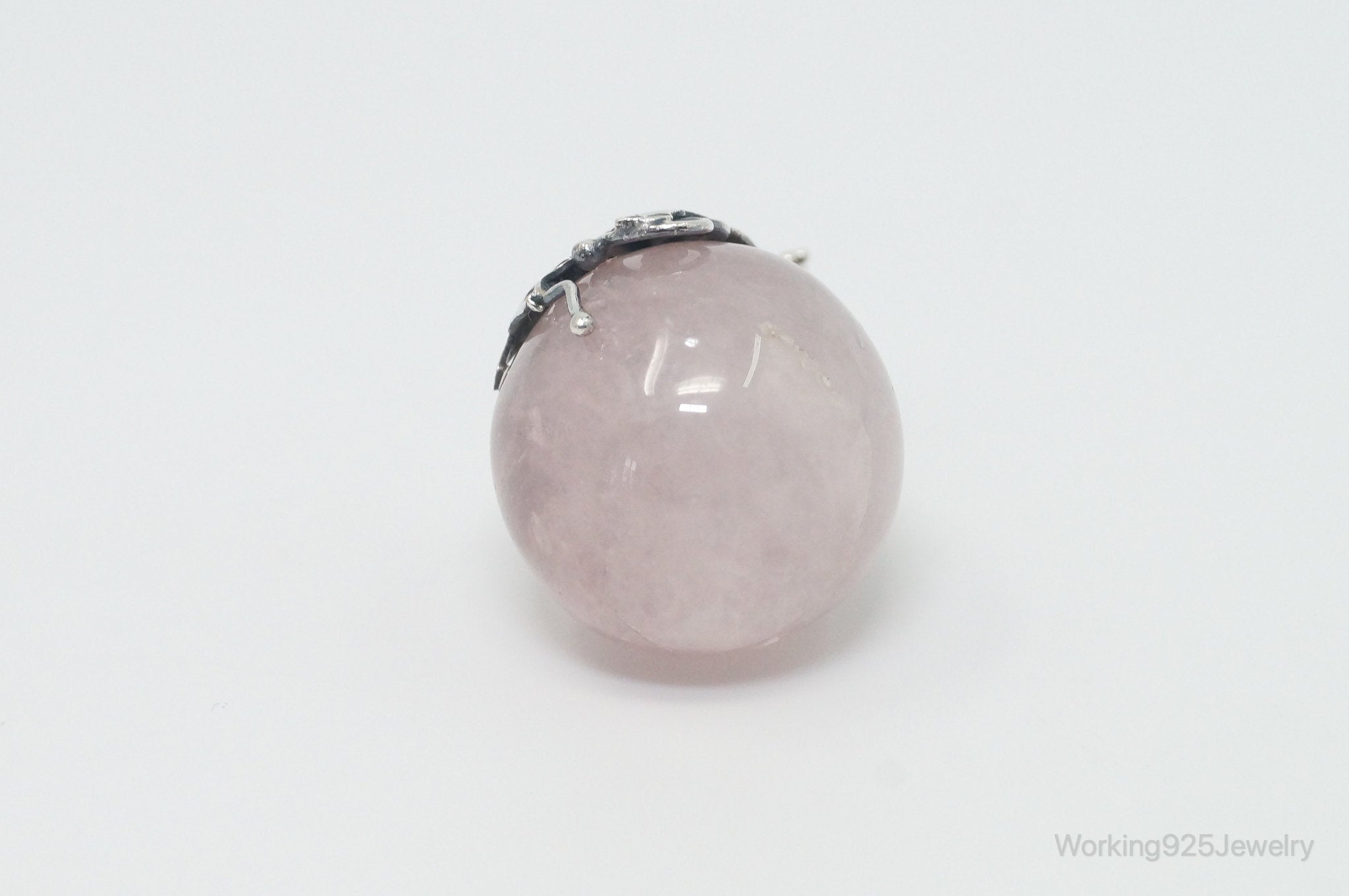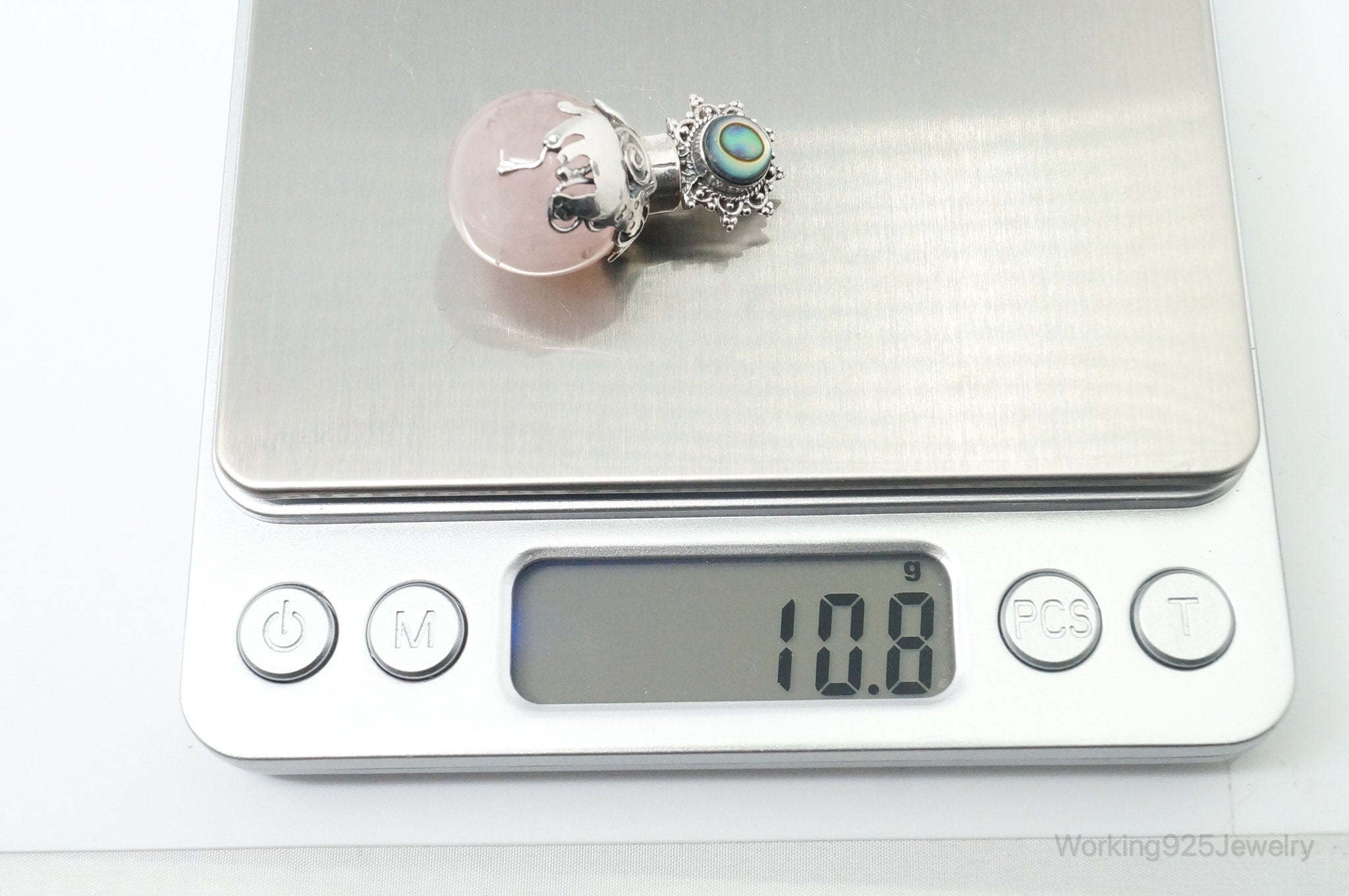 Vintage Rose Quartz Abalone Shell Bali Cat Sterling Silver Necklace Pendant
