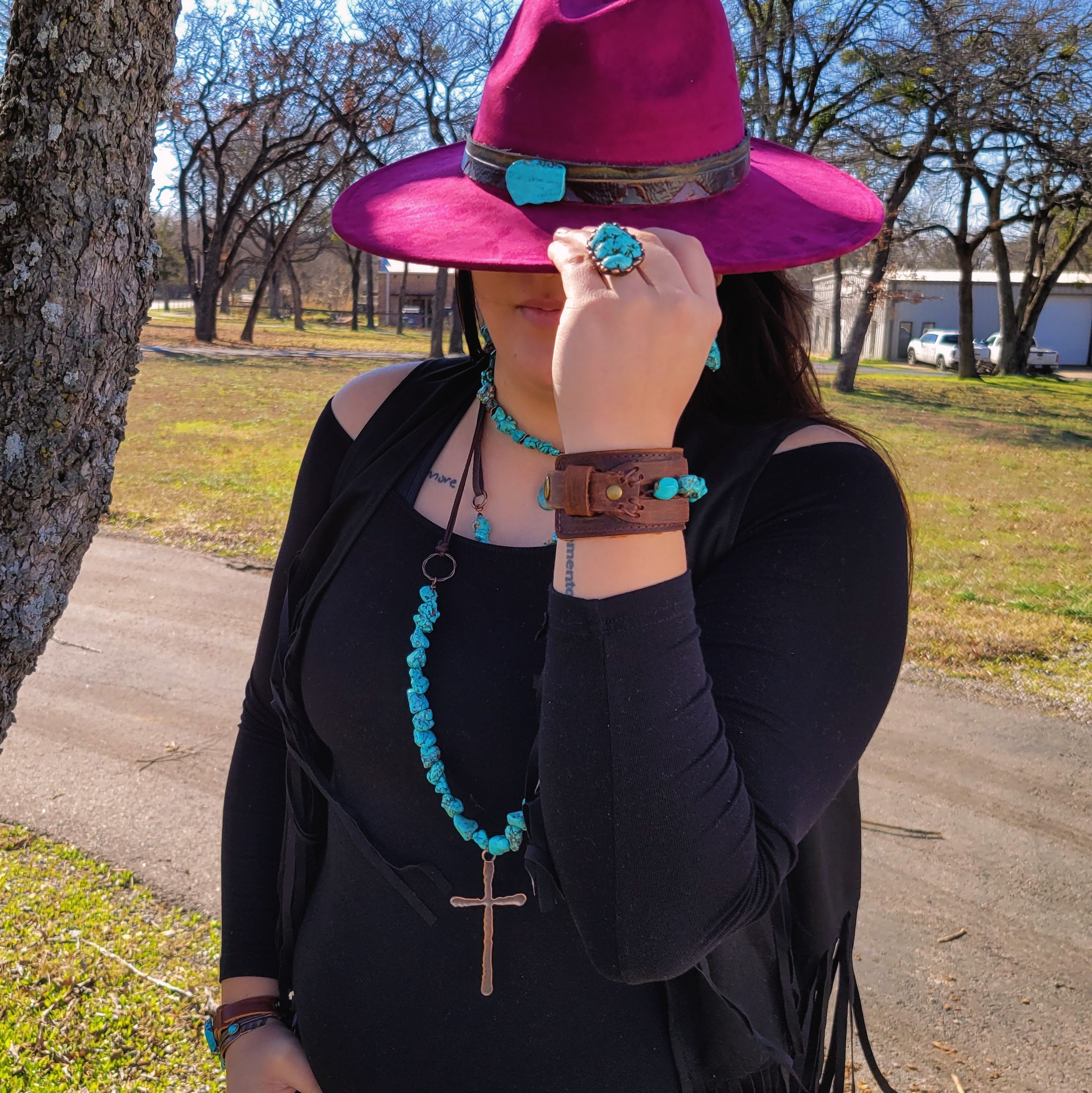 This handcrafted artisan boho necklace features a striking blue turquoise stone and a beautiful copper cross pendant. Elevate any outfit with this unique and eye-catching piece, the perfect addition to any jewelry collection. Handmade with care, this necklace is sure to make a statement.